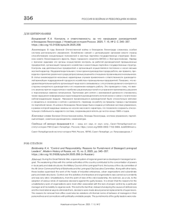 В годы Великой Отечественной войны в блокадном Ленинграде сложилась особая система регионального управления. Ослабление связей с центральными органами власти страны способствовало концентрации полномочий в местных партийно-государственных структурах: Военном совете Ленинградского фронта, бюро городского комитета ВКП(б) и Ленгорисполкоме. Наряду с прочими задачами эти органы осуществляли контроль за работой руководителей промышленных предприятий, организаций городского хозяйства и нижестоящих партийно-государственных структур. Контроль над деятельностью предприятий и организаций осуществлялся постоянно и носил весьма жесткий характер. Неудовлетворительная с точки зрения руководства города работа, как правило, приводила к принятию различного рода репрессивных решений в отношении провинившихся начальников. В статье анализируются несколько характерных случаев привлечения к ответственности руководителей важнейших подразделений городского хозяйства и промышленных предприятий. Показано, что неудовлетворительная работа организаций чаще всего связывалась с отсутствием должного контроля со стороны конкретного руководителя и его неумением наладить работу. Это приводило к тому, что вместо анализа причин недостатков и наиболее рациональных путей их устранения принимались решения о персональных заменах начальников. Причинами для снятия с занимаемой должности становились также нарушения неформальных норм поведения руководителей в личной жизни и связи с политически неблагонадежными людьми. Наказания провинившихся руководителей были относительно мягкими и сводились в основном к снятию с должности, переводу на работу за пределы города и выговорам по партийной линии. В целом в блокадном Ленинграде была создана устойчивая система управления, в рамках которой кадровые замены не носили массового характера, что позволило сохранить относительную стабильность кадрового состава, сохранившуюся вплоть до чисток конца 1940-х годов.