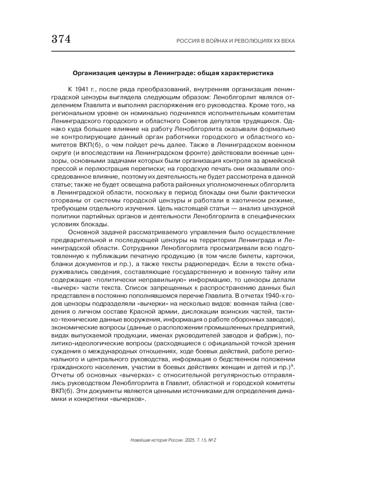 В статье на основе источников из фондов федеральных и региональных архивов рассматривается цензурная политика, проводившаяся в Ленинграде в специфических условиях блокады 1941-1944 гг. После разрыва связи Ленинградского областного и городского управления по делам литературы и издательств (Леноблгорлита) с Главлитом в сентябре 1941 г. городской комитет ВКП(б) стал оказывать решающее влияние на цензуру. Из-за близости линии фронта, кризисной ситуации в городском хозяйстве и замкнутости информационного пространства Ленинграда партийные руководители стремились ужесточить цензурную политику и давали соответствующие указания Леноблгорлиту. Это выразилось в ограничении публикации всех сведений, которые могли быть использованы противником (включая адреса городских учреждений и даты ближайших массовых мероприятий), и запрете на распространение «политически неправильной» информации о повседневной жизни ленинградцев в условиях гуманитарной катастрофы. Главлит не применял подобные радикальные меры в других регионах СССР, но санкционировал проводимую в Ленинграде цензурную политику. Более того, в 1943-1944 гг. Леноблгорлит несколько раз побеждал в социалистическом соревновании цензоров и завоевывал Красное знамя Уполномоченного СНК СССР по охране военных тайн в печати, центральное руководство считало его работу образцовой. В то же время ленинградские партийные работники относились к цензорам более настороженно и неоднократно критиковали их за недостаточную жесткость. После прорыва и снятия блокады деятельность Леноблгорлита постепенно вернулась в довоенное русло, но особенности работы цензоров в рассматриваемый период оказали значительное влияние на формирование и распространение образа осажденного города в СМИ и произведениях культуры 1940-х годов.