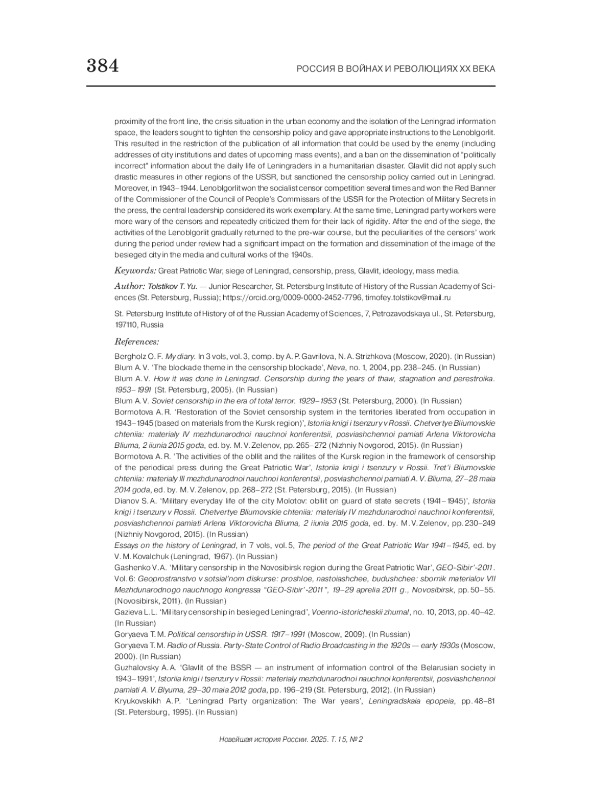 19. Петровичева Е. М., Тряхов И. С. Цензура в годы Великой Отечественной войны 1941-1945 гг. (по материалам Владимирского края) // Вестник Ленинградского государственного университета им. А. С. Пушкина. 2015. № 1. С. 49-59. EDN: TXHTTH