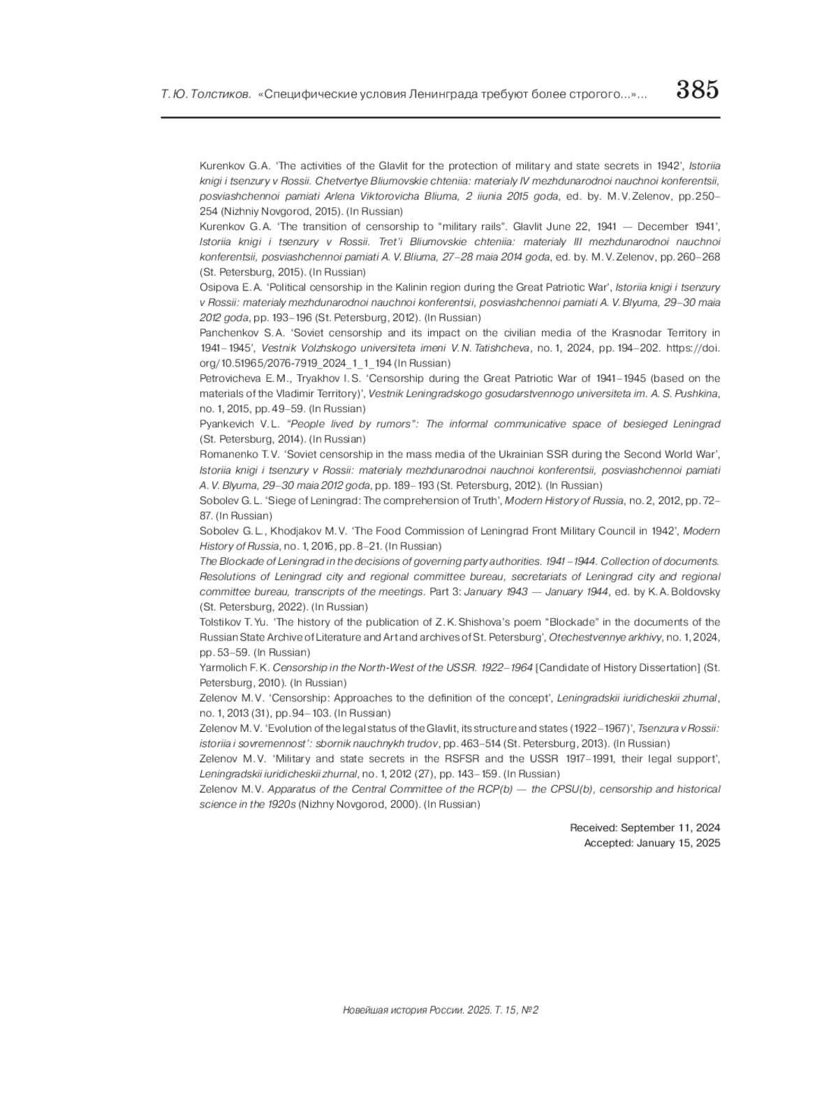 14. Куренков Г. А. Переход цензуры на “военные рельсы”. Главлит 22 июня 1941 г. - декабрь 1941 г. // История книги и цензуры в России. Третьи Блюмовские чтения: мат-лы III междунар. науч. конф., посвящ. памяти А. В. Блюма, 27-28 мая 2014 г. / науч. ред. М. В. Зеленов. СПб., 2015. С. 260-268.
