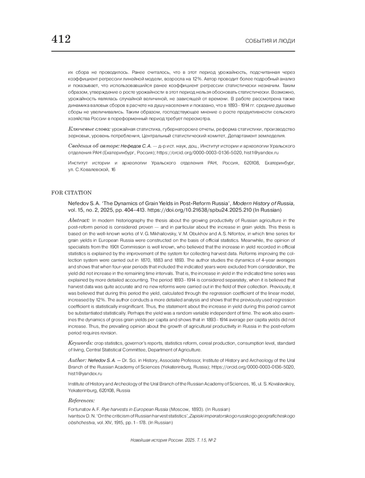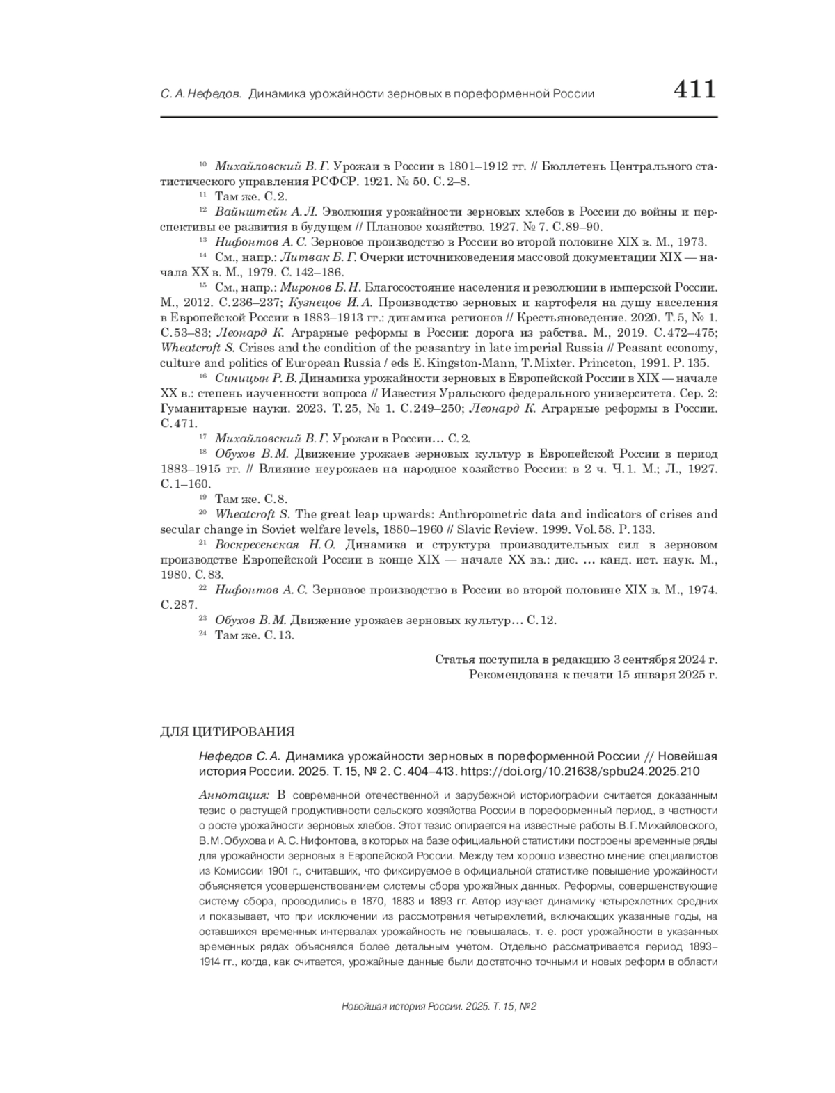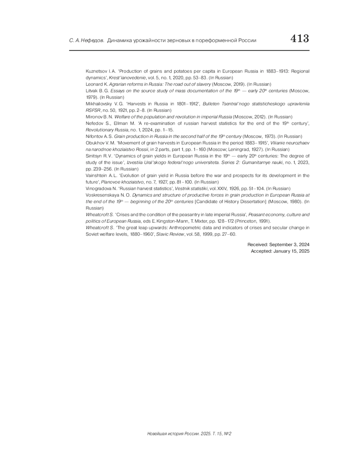 5. Nefedov S., Ellman M. A re-examination of russian harvest statistics for the end of the nineteenth century // Revolutionary Russia. 2024. No. 1. P. 1-15. EDN: HSADBW