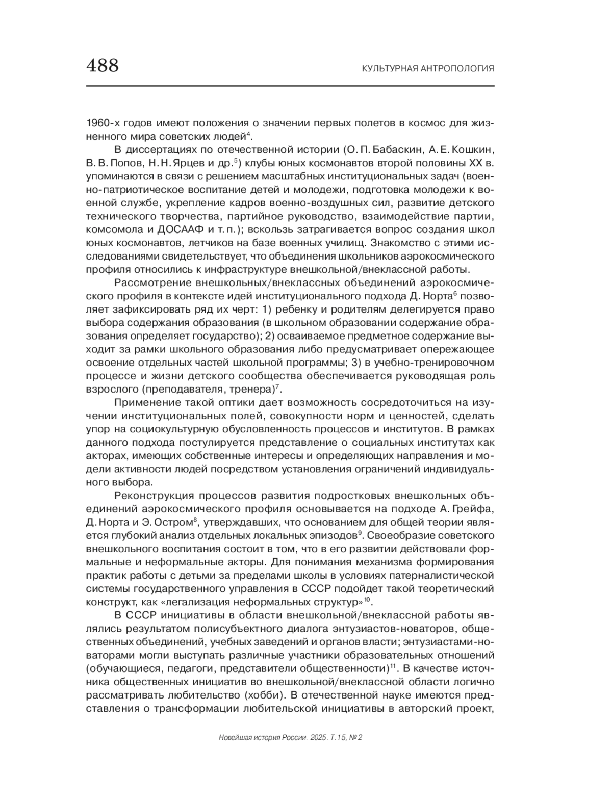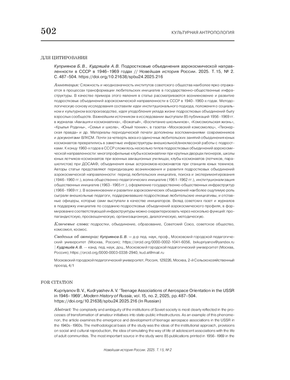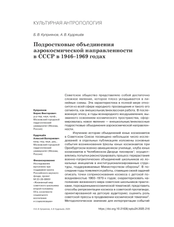 Сложность и неоднозначность институтов советского общества наиболее ярко отражается в процессах трансформации любительских инициатив в государственно-общественные инфраструктуры. В качестве примера этого явления в статье рассматриваются возникновение и развитие подростковых объединений аэрокосмической направленности в СССР в 1940-1960-х годах. Методологическую основу исследования составили идеи институционального подхода, положения о социальном и культурном воспроизводстве, идея уподобления уклада жизни подростковых объединений быту взрослых сообществ. Важнейшим источником в исследовании выступали 85 публикаций 1956-1969 гг. в журналах «Авиация и космонавтика», «Вожатый», «Воспитание школьников», «Комсомольская жизнь»,«Крылья Родины», «Семья и школа», «Юный техник», в газетах «Московский комсомолец», «Пионерская правда» и др. Материалы периодической печати дополнены воспоминаниями современников и документами ВЛКСМ. Почти за четверть века из одиночных любительских занятий объединения юных космонавтов превратились в заметные инфраструктуры внешкольной/внеклассной работы с подростками. К концу 1960-х годов в СССР сложилось несколько типов подростковых объединений аэрокосмической направленности: многопрофильные клубы космонавтики при крупных дворцах пионеров, школы юных летчиков-космонавтов при военных авиационных училищах, клубы космонавтов (летчиков, парашютистов) при ДОСААФ, объединения юных астрономов-космонавтов при станциях юных техников. Авторы статьи представляют периодизацию возникновения и развития подростковых объединений аэрокосмической направленности: период любительских инициатив, поиска и экспериментирования (1946-1960 гг.), волна общественно-педагогических инициатив (1961-1962 гг.), институционализация общественных инициатив (1963-1965 гг.), оформление государственно-общественных инфраструктур (1966-1969 гг.). В возникновении и развитии аэрокосмических объединений наиболее ощутимую роль сыграли внешкольные педагоги, поддерживавшие подростковые любительские инициативы, и отставные офицеры, которые сами выступали в качестве инициаторов. Вклад советских газет и журналов в поддержку инициатив по созданию подростковых объединений аэрокосмического профиля, в формирование соответствующей инфраструктуры можно охарактеризовать через несколько функций: пропагандистскую, просвещенческую, организационную, диалогическую, методическую.