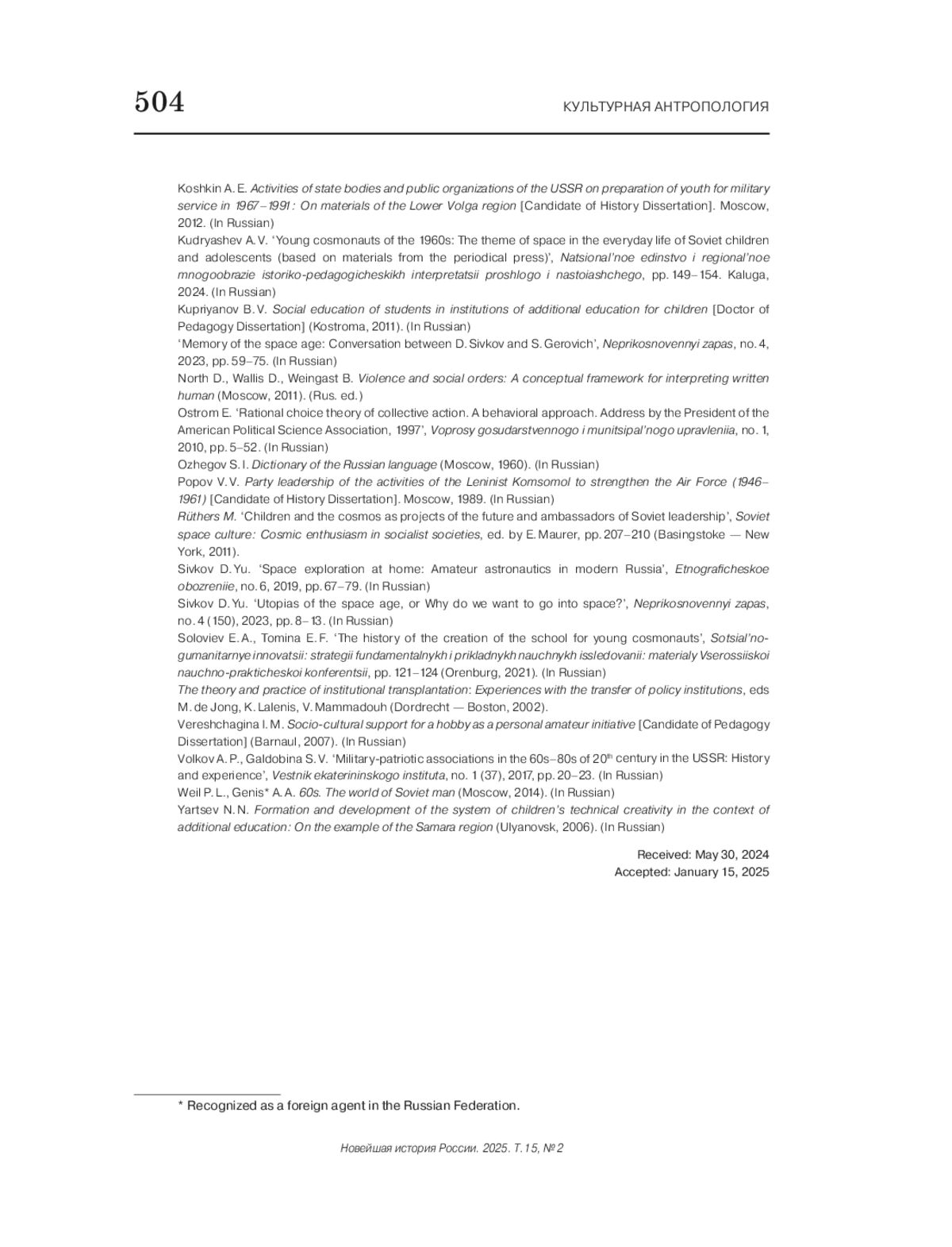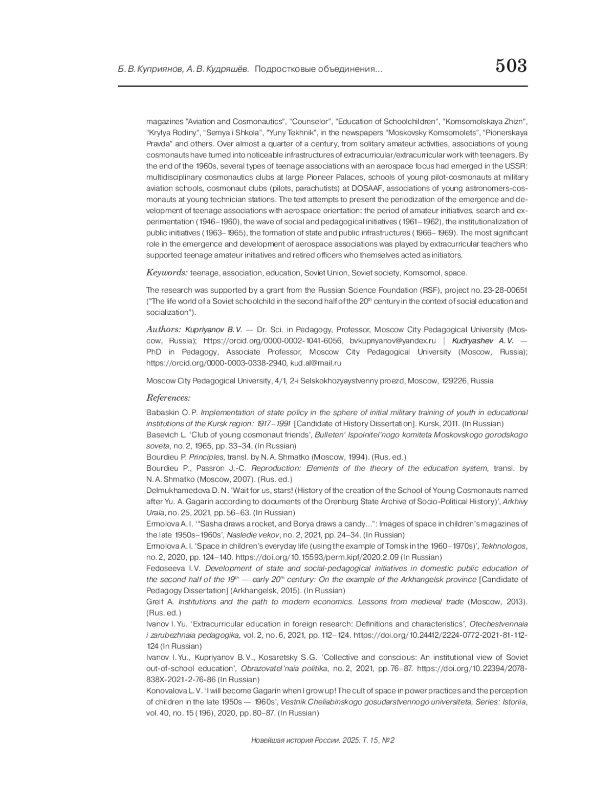 8. Кудряшёв А. В. Юные космонавты 1960-х годов: тема космоса в советской детской и подростковой повседневности (по материалам периодической печати) // Национальное единство и региональное многообразие историко-педагогических интерпретаций прошлого и настоящего. Калуга, 2024. С. 149-154.