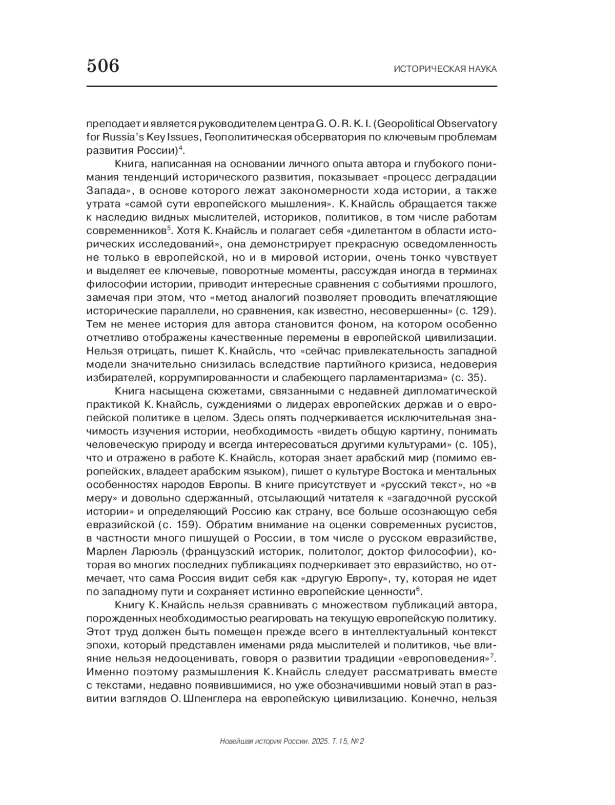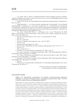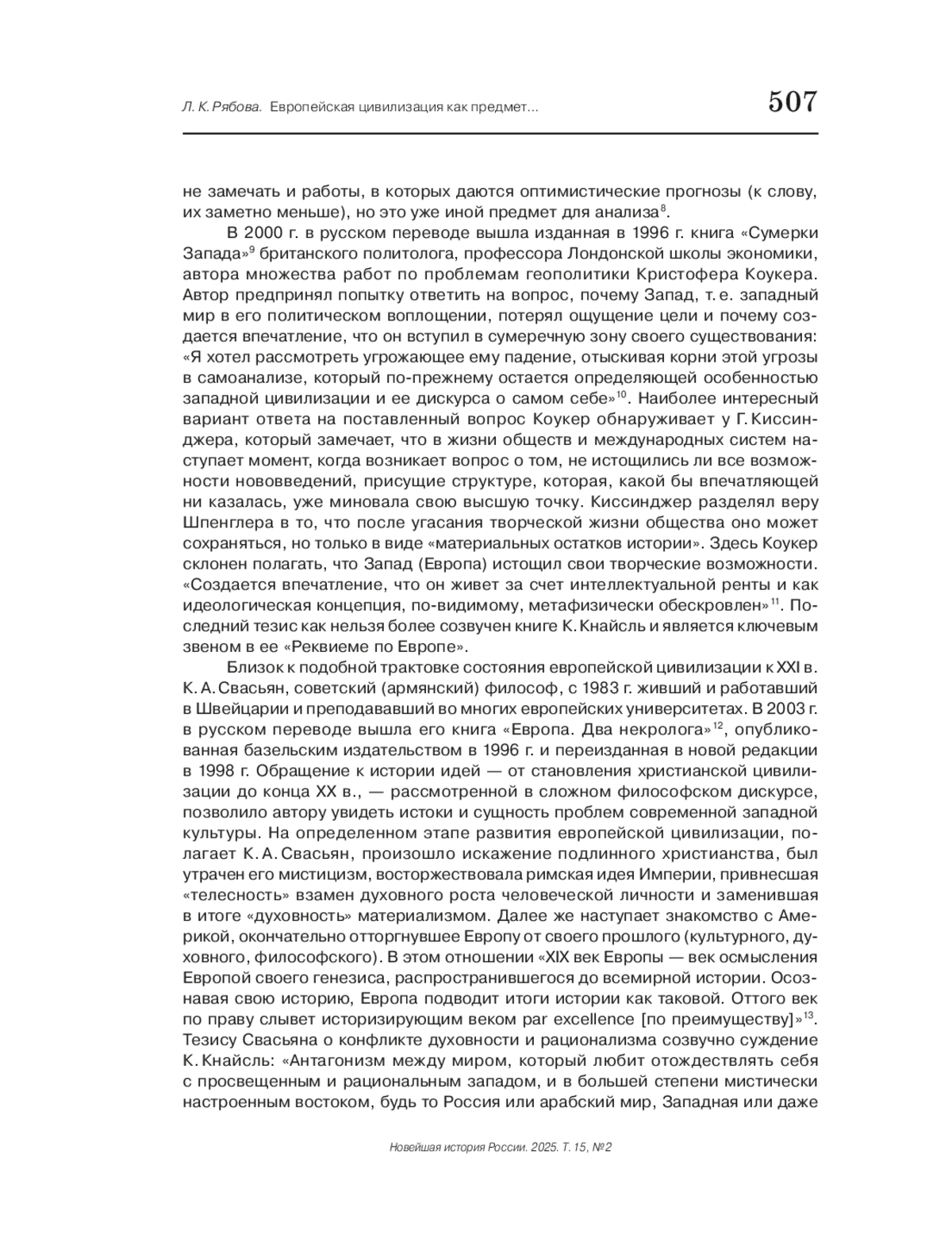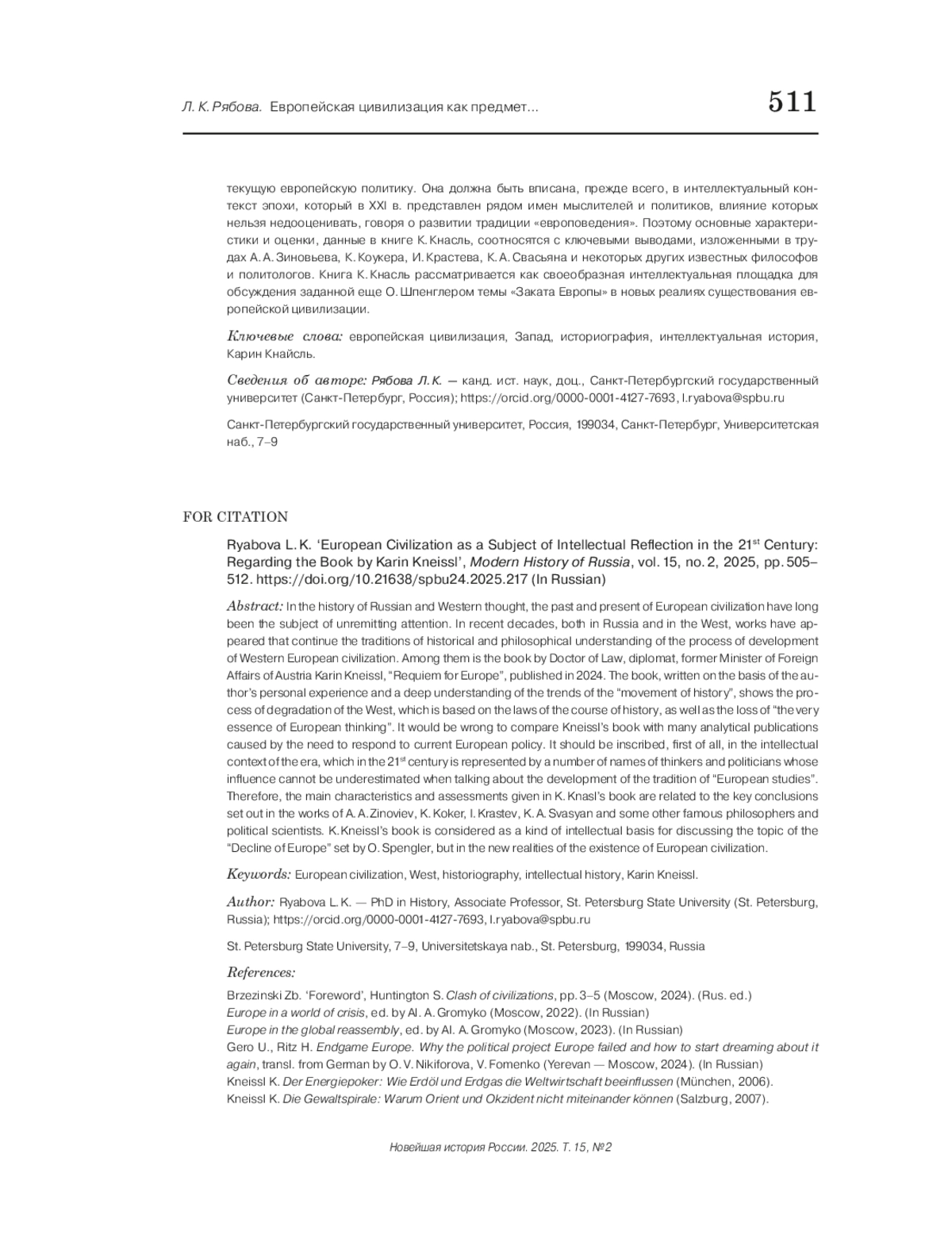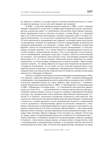 В истории российской и западной мысли прошлое и настоящее европейской цивилизации уже в течение длительного времени является предметом неослабевающего внимания. В последние десятилетия, как в России, так и на Западе появились работы, продолжающие традиции историко-философского осмысления процесса развития западноевропейской цивилизации. К числу последних относится и вышедшая в 2024 г. книга доктора юридических наук, дипломата, бывшего министра иностранных дел Австрии Карин Кнайсль «Реквием по Европе». Книга, написанная на основании личного опыта автора и глубокого понимания тенденций «движения истории», показывает процесс деградации Запада, в основе которого лежат закономерности хода истории, а также утрата «самой сути европейского мышления» - свободы и главенства закона. Было бы неверным сравнивать книгу Кнайсль с множеством аналитических публикаций, порожденных необходимостью реагировать натекущую европейскую политику. Она должна быть вписана, прежде всего, в интеллектуальный контекст эпохи, который в XXI в. представлен рядом имен мыслителей и политиков, влияние которых нельзя недооценивать, говоря о развитии традиции «европоведения». Поэтому основные характеристики и оценки, данные в книге К. Кнасль, соотносятся с ключевыми выводами, изложенными в трудах А. А. Зиновьева, К. Коукера, И. Крастева, К. А. Свасьяна и некоторых других известных философов и политологов. Книга К. Кнасль рассматривается как своеобразная интеллектуальная площадка для обсуждения заданной еще О. Шпенглером темы «Заката Европы» в новых реалиях существования европейской цивилизации.