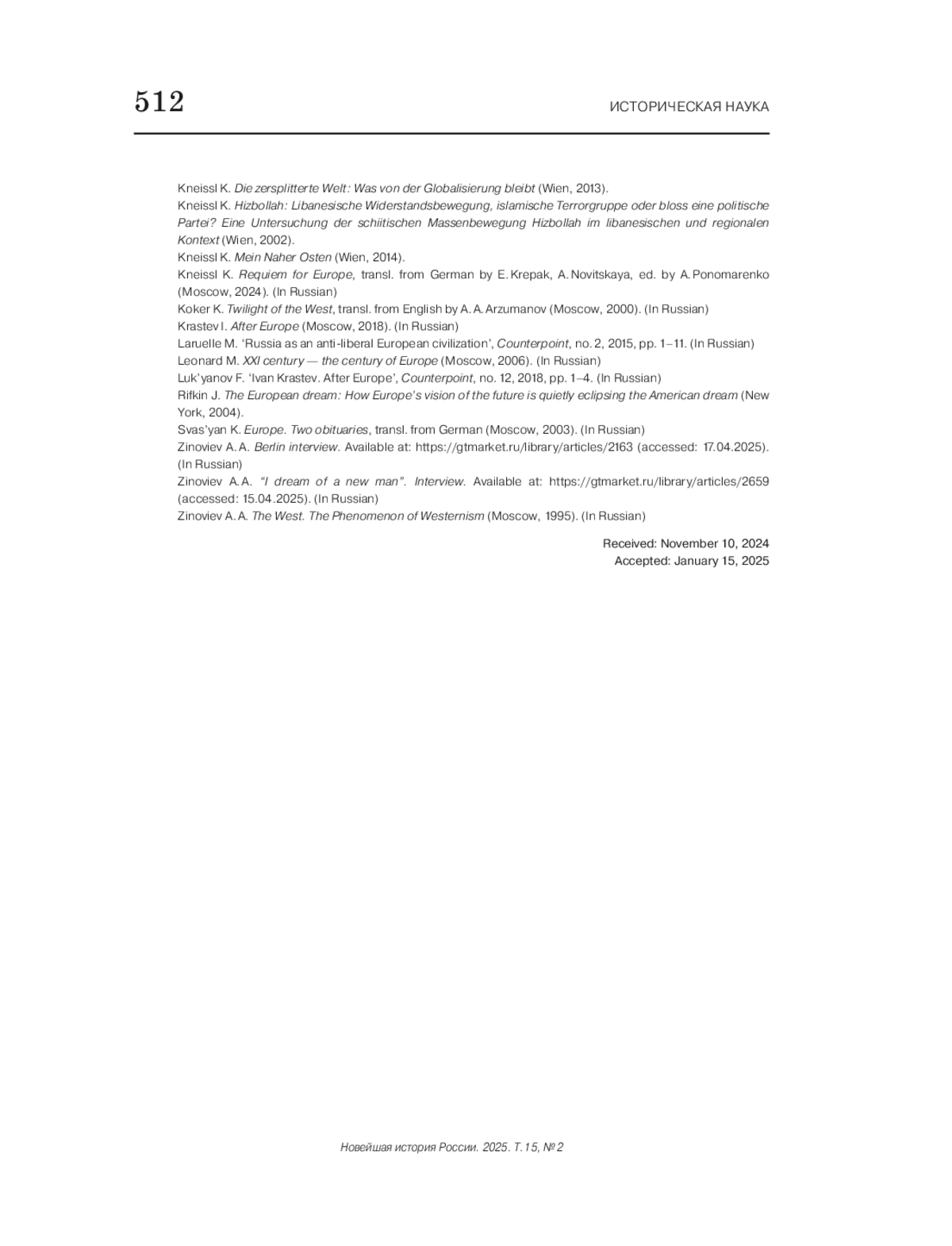 3. Кнайсль К. Реквием по Европе / пер. с нем. Е. Крепак, А. Новицкой; ред. А. Пономаренко. М.: Полит. энцикл., 2024.