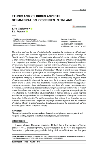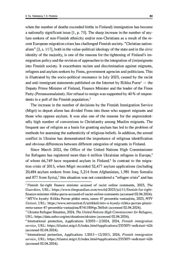 Among Western European countries, Finland has a low number of immigrants — 461.2 thousand people, but it corresponds to 8.5 % of the population. Due to the population ageing and declining birth rate (2016 was the first year when the number of deaths exceeded births in Finland) immigration has become a nationally significant issue [1, р. 75]. The sharp increase in the number of asylum seekers of non-Finnish ethnicity and/or non-Christians as a result of the recent European migration crises has challenged Finnish society. “Christian nationalism” [2, s. 117], both in the value-political ideology of the state and in the civic identity of the majority, is one of the reasons for the tightening of Finland’s immigration policy and the revision of approaches to the integration of (im)migrants into Finnish society.