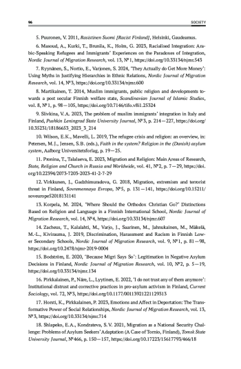 6. Masoud, A., Kurki, T., Brunila, K., Holm, G. 2023, Racialised Integration: Arabic-Speaking Refugees and Immigrants’ Experiences on the Paradoxes of Integration, Nordic Journal of Migration Research, vol. 13, № 1,. DOI: 10.33134/njmr.543 EDN: DEONOV