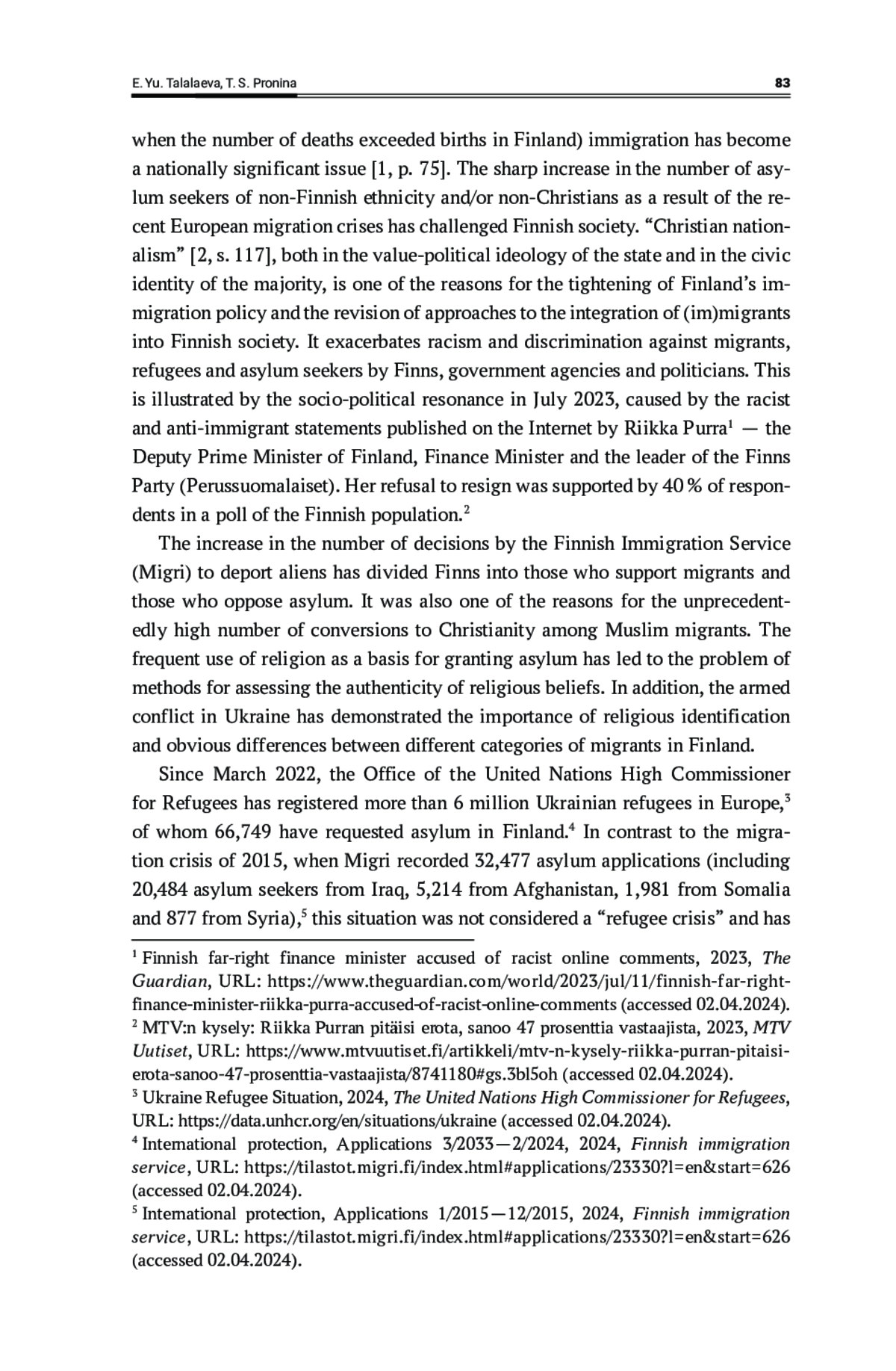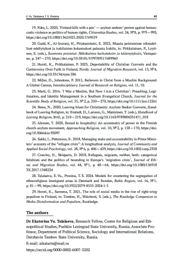 21. Horsti, K., Pirkkalainen, P. 2023, Deportability of Christian Converts and the Controversy Over Faith in Finland, Nordic Journal of Migration Research, vol. 13, № 4,. DOI: 10.33134/njmr.586 EDN: CWCEXI