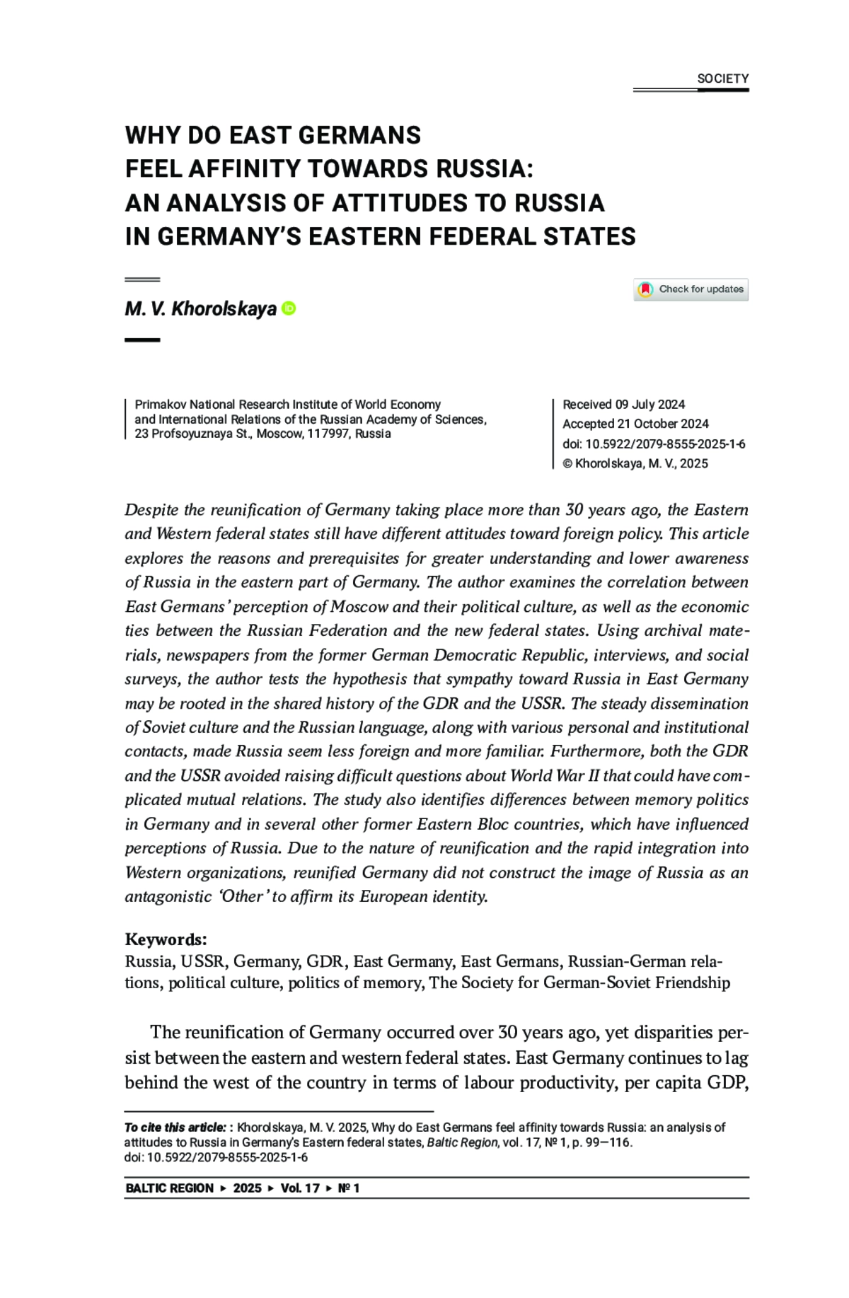 Despite the reunification of Germany taking place more than 30 years ago, the Eastern and Western federal states still have different attitudes toward foreign policy. This article explores the reasons and prerequisites for greater understanding and lower awareness of Russia in the eastern part of Germany. The author examines the correlation between East Germans’ perception of Moscow and their political culture, as well as the economic ties between the Russian Federation and the new federal states. Using archival materials, newspapers from the former German Democratic Republic, interviews, and social surveys, the author tests the hypothesis that sympathy toward Russia in East Germany may be rooted in the shared history of the GDR and the USSR. The steady dissemination of Soviet culture and the Russian language, along with various personal and institutional contacts, made Russia seem less foreign and more familiar. Furthermore, both the GDR and the USSR avoided raising difficult questions about World War II that could have complicated mutual relations. The study also identifies differences between memory politics in Germany and in several other former Eastern Bloc countries, which have influenced perceptions of Russia. Due to the nature of reunification and the rapid integration into Western organizations, reunified Germany did not construct the image of Russia as an antagonistic ‘Other’ to affirm its European identity