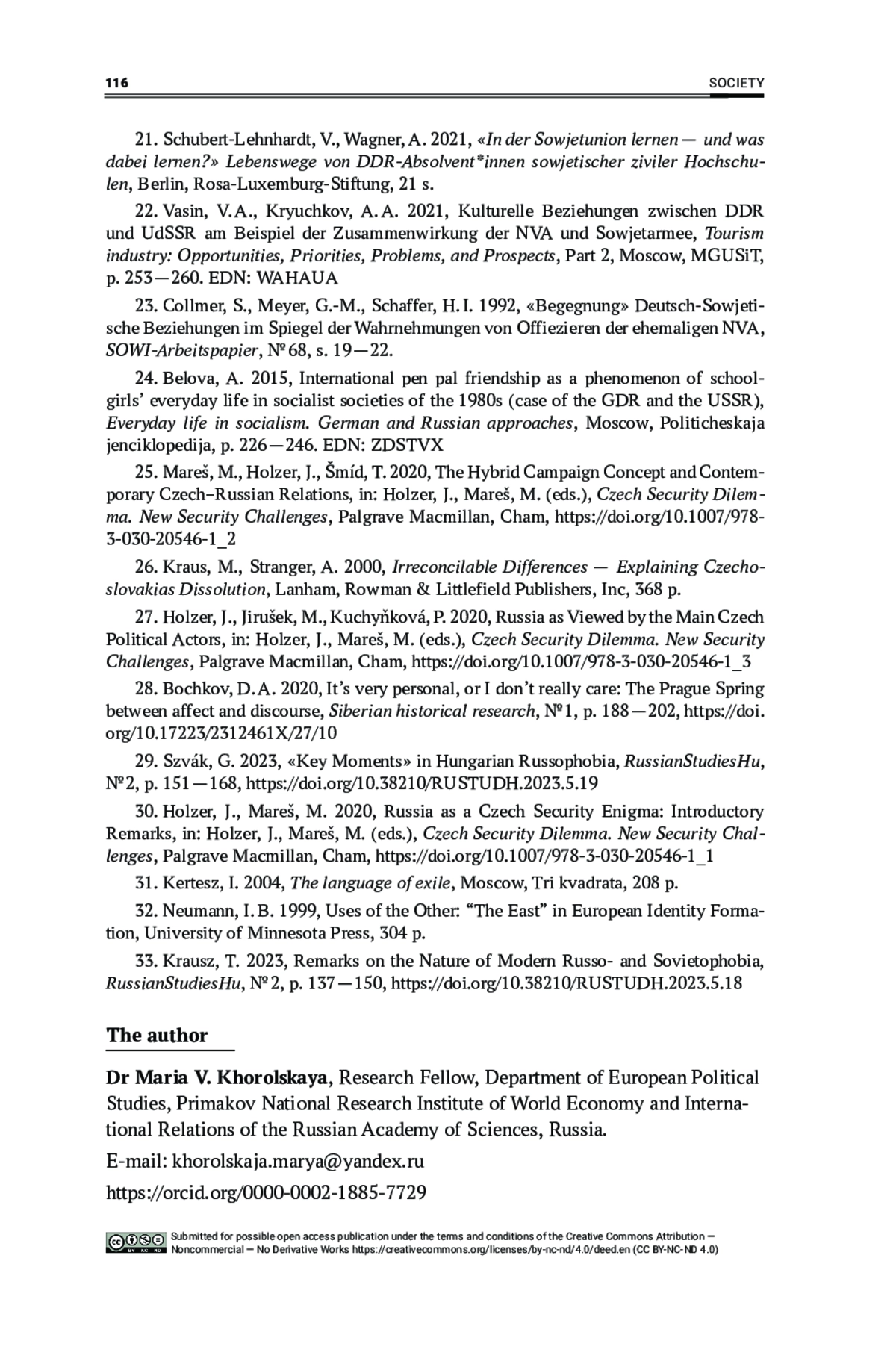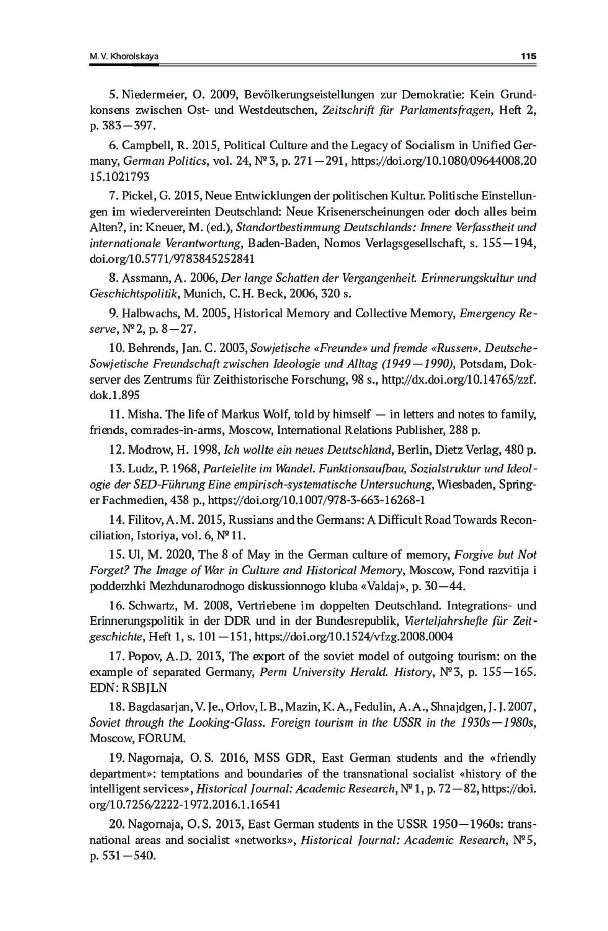 19. Nagornaja, O. S. 2016, MSS GDR, East German students and the “friendly department”: temptations and boundaries of the transnational socialist “history of the intelligent services”, Historical Journal: Academic Research, № 1, p. 72-82,. DOI: 10.7256/2222-1972.2016.1.16541