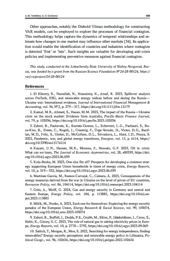 1. El Khoury, R., Nasrallah, N., Hussainey, K., Assaf, R. 2023, Spillover analysis across FinTech, ESG, and renewable energy indices before and during the Russia-Ukraine war: International evidence, Journal of International Financial Management & Accounting, vol. 34, № 2, p. 279-317,. DOI: 10.1111/jifm.12179 EDN: RAKJPP
