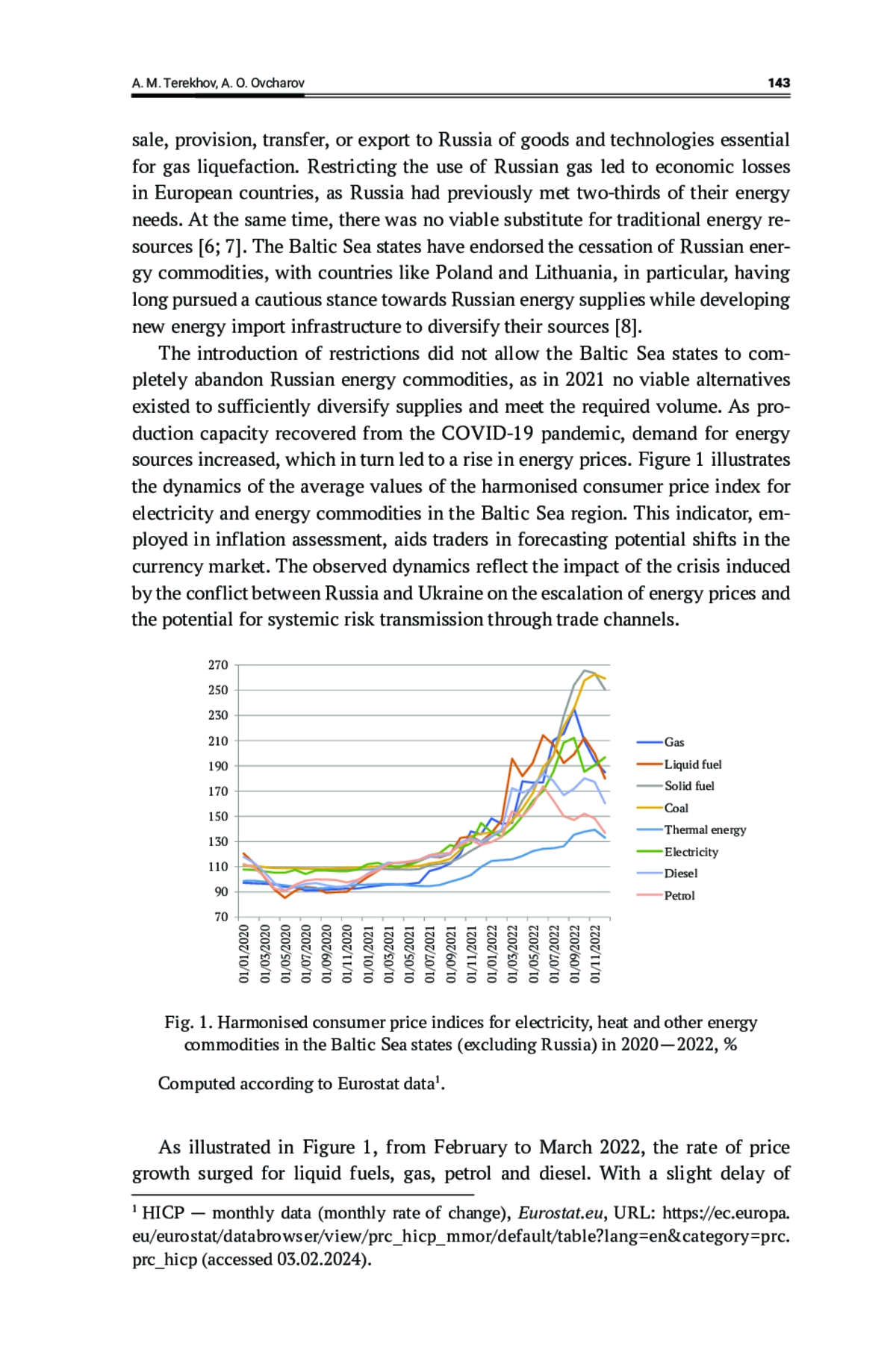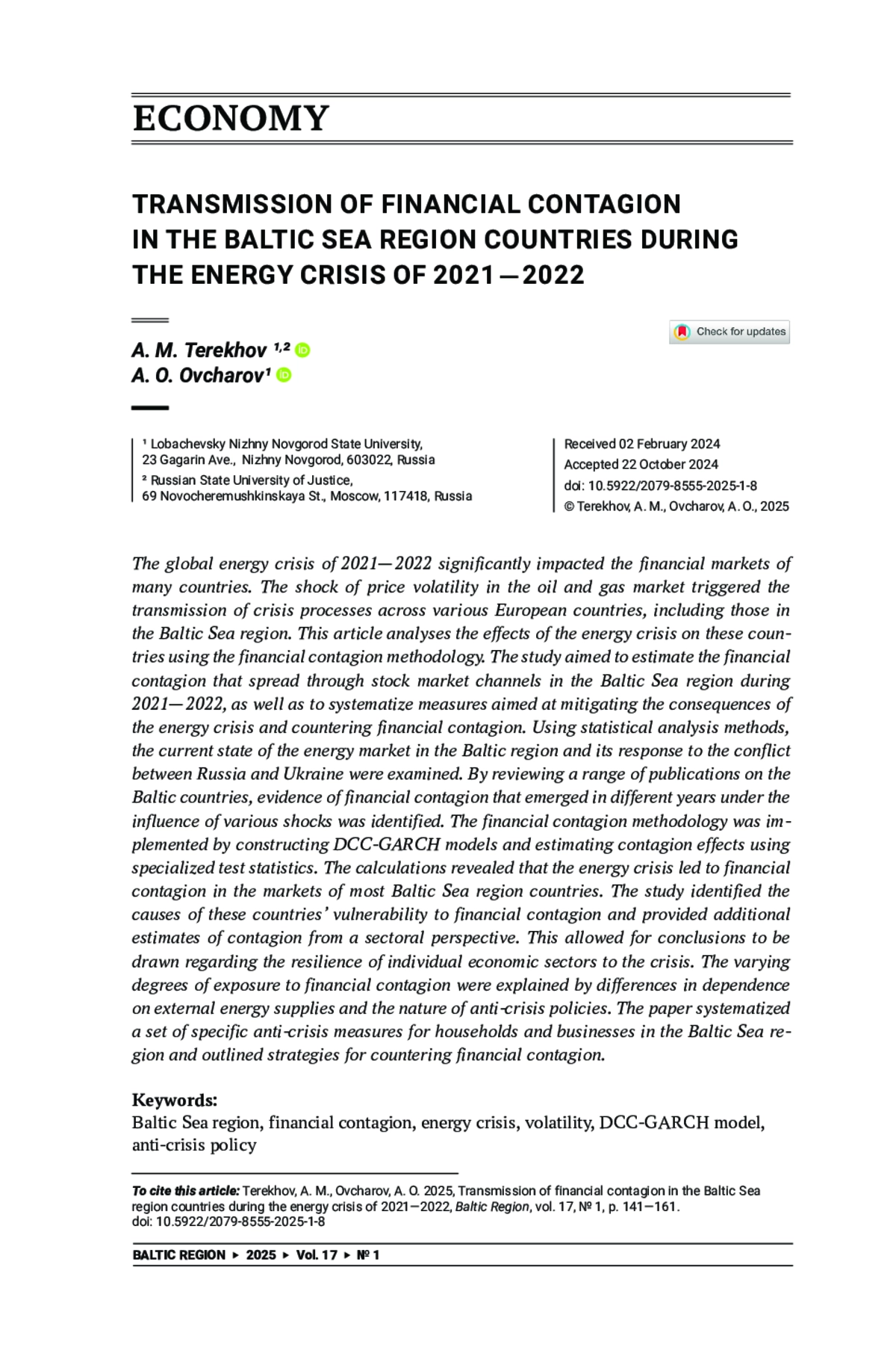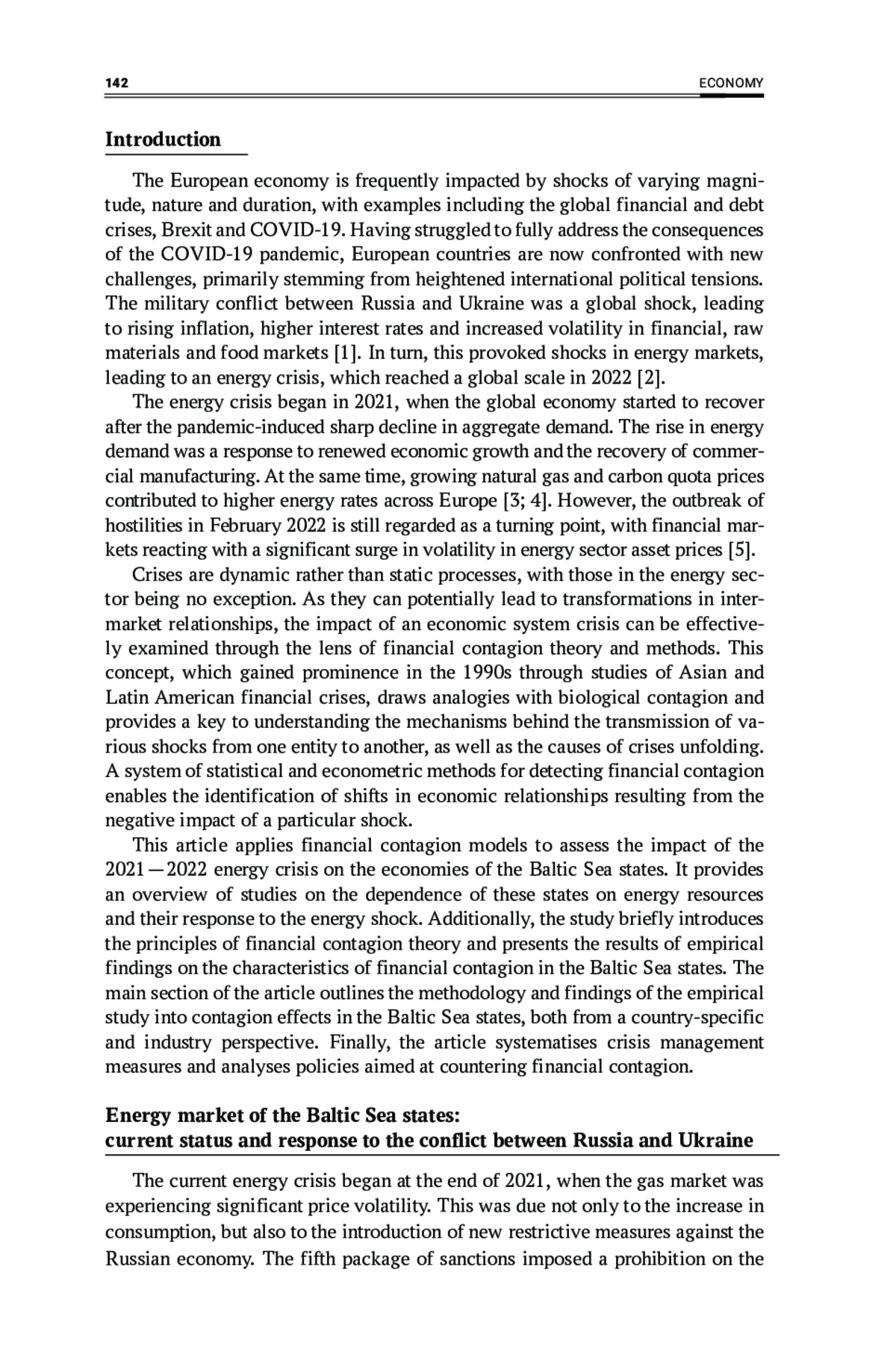 The global energy crisis of 2021—2022 significantly impacted the financial markets of many countries. The shock of price volatility in the oil and gas market triggered the transmission of crisis processes across various European countries, including those in the Baltic Sea region. This article analyses the effects of the energy crisis on these countries using the financial contagion methodology. The study aimed to estimate the financial contagion that spread through stock market channels in the Baltic Sea region during 2021—2022, as well as to systematize measures aimed at mitigating the consequences of the energy crisis and countering financial contagion. Using statistical analysis methods, the current state of the energy market in the Baltic region and its response to the conflict between Russia and Ukraine were examined. By reviewing a range of publications on the Baltic countries, evidence of financial contagion that emerged in different years under the influence of various shocks was identified. The financial contagion methodology was implemented by constructing DCC-GARCH models and estimating contagion effects using specialized test statistics. The calculations revealed that the energy crisis led to financial contagion in the markets of most Baltic Sea region countries. The study identified the causes of these countries’ vulnerability to financial contagion and provided additional estimates of contagion from a sectoral perspective. This allowed for conclusions to be drawn regarding the resilience of individual economic sectors to the crisis. The varying degrees of exposure to financial contagion were explained by differences in dependence on external energy supplies and the nature of anti-crisis policies. The paper systematized a set of specific anti-crisis measures for households and businesses in the Baltic Sea region and outlined strategies for countering financial contagion.