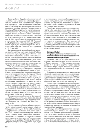 The article is devoted to the analysis of stylistic, technical, and technological features of the metal sculpture of the bodhisattva Maitreya from the State Museum of Oriental Art, which make it possible to attribute this work to the Tibetan artistic tradition of the 15th century. Its previous attribution was Western Tibet, 18th century, and this version was based on the nature of the alloy. However, we do not believe that this factor is a priority in this case. Thanks to numerous analogies, it is possible to identify the characteristic features of Western Tibetan works. For example, the attraction to archaic models and decorative details typical of Indian plastic art, as well as the lack of strict proportionality. At the same time, in the sculpture of Maitreya from the collection of the State Museum of Oriental Art, we find a number of features that are not found in Western Tibetan plastic art. Among these features, we can note the adherence to the iconometric canon, which ensures the balance of the figure’s placement in space and the compositional “rhythm” of the work; a high level of detail of all internal volumes; the presence of such techniques as engraving and cabochon inlay of semiprecious stones and minerals, and inlay of metals of different colours (silver and copper); the nature of the models of the Bodhisattva’s face and body parts. Another feature of the sculpture is the appeal to the Pala-Sena style, which developed in northeastern India from the 8th to the 12th centuries. The rulers of the Pala dynasty were adherents of Buddhism. By the 12th century, the territories of the Pala Empire were conquered by representatives of the Hindu Sena dynasty. During this period, Buddhism declined, and Buddhist sculptors migrated to Tibet. Tibetan masters turned to the artistic solutions of previous eras, and therefore numerous imitations of the Pala-Sena style have come down to us. Tibetan samples from the 14th-15th centuries represent a reinterpretation of proportions and shapes, which were reproduced by North Indian masters. On the basis of this school, the art of Tibetan metal sculpture flourished, due to the well-being of the socio-political situation of that time, which made it possible to concentrate labour and material resources in monasteries.