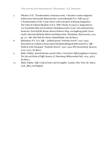 7. Николаев Д.Д. Трансформация “комизма нормы” в литературе русской эмиграции: столкновение культурных идентичностей в произведениях Н.А. Тэффи 1920 г. // Imaginationen von Transkulturalität und Geschlecht: Identitätsnarrative in süd- und ostslawistischen Kontexten. Festschrift für Renate HansenKokoruš / Herausgegeben von Ingeborg Jandl, Goran Lazičić, Marizela Reithofer Bektić und Dijana Simić. Wiesbaden: Harrassowitz 2021. S. 171-188. (Die Welt der Slaven: Sammelbände. 66). EDN: EYZINY