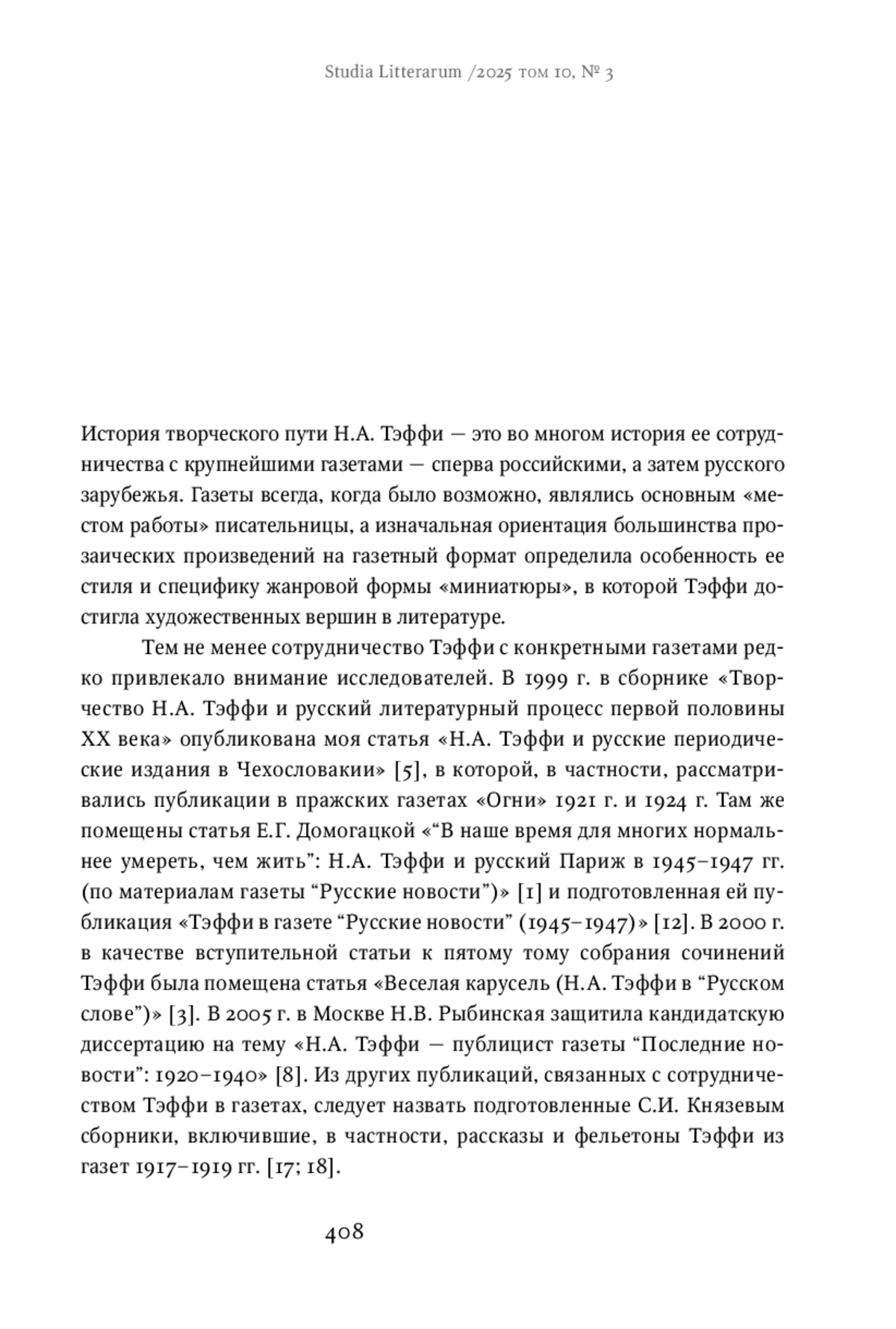 5. Николаев Д.Д. Н.А. Тэффи и русские периодические издания в Чехословакии // Творчество Н.А. Тэффи и русский литературный процесс первой половины XX века. М.: ИМЛИ РАН; Наследие, 1999. С. 111-147. EDN: VMODQX