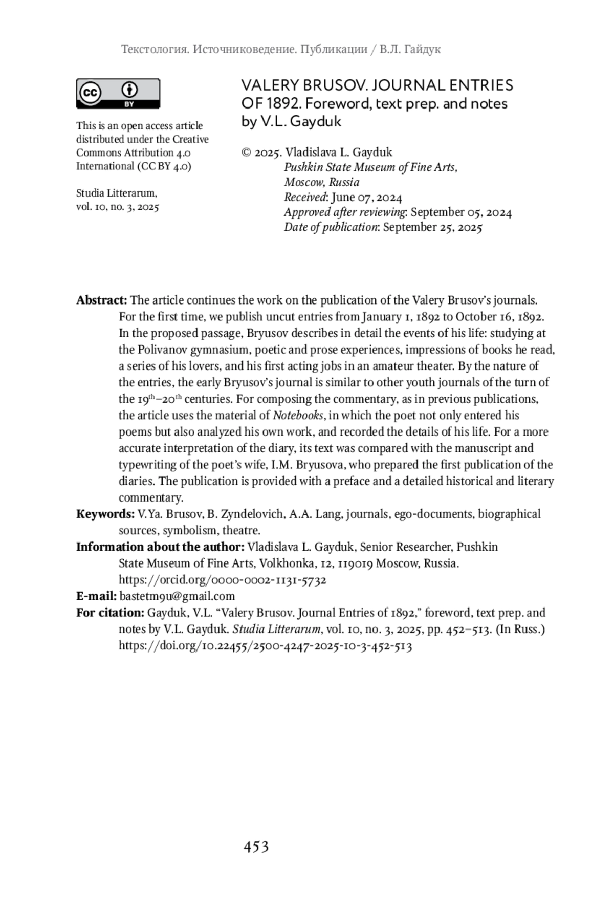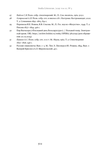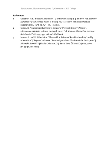 5. Богомолов Н.А., Гайдук В.Л. Валерий Брюсов. Дневник 1891 // Studia Litterarum. 2022. Т. 7, № 1. С. 414-471. DOI: 10.22455/2500-4247-2022-7-1-414-471 EDN: QRFIFL