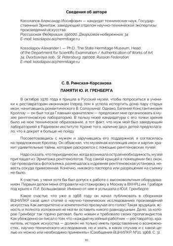 В октябре 1970 года я пришла в Русский музей, чтобы попроситься в ученики к реставраторам-иконникам (перед тем я успела испортить дома пару старых икон, начитавшись романтического В. Солоухина). Однако, Евгений Константинович Кроллау — он был тогда Главным хранителем — предложил мне организовать в музее рентгеновскую лабораторию. В пользу моей кандидатуры с его точки зрения было не мое техническое образование, а тот факт, что муж мой был заведующим лабораторией в Радиевом институте. Кроме того, наличие двух детей предполагало, что в декрет я больше не пойду.