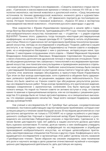 Он был старше меня по возрасту, ярче как личность, масштабнее как ученый. Когда я появился во ВЦНИЛКР в 1971 году, я был начинающим реставратором-практиком и, по существу, понятия не имел о содержании настоящей научной деятельности. Постепенно у меня вырисовывались представления об уровне специалистов, которые окружали на новом месте работы. И в первую очередь я должен упомянуть Ю. И. Гренберга, Г. А. Кошеленко, Л. А. Лелекова, В. В. Филатова, Г. З. Быкову, А. В. Иванову.