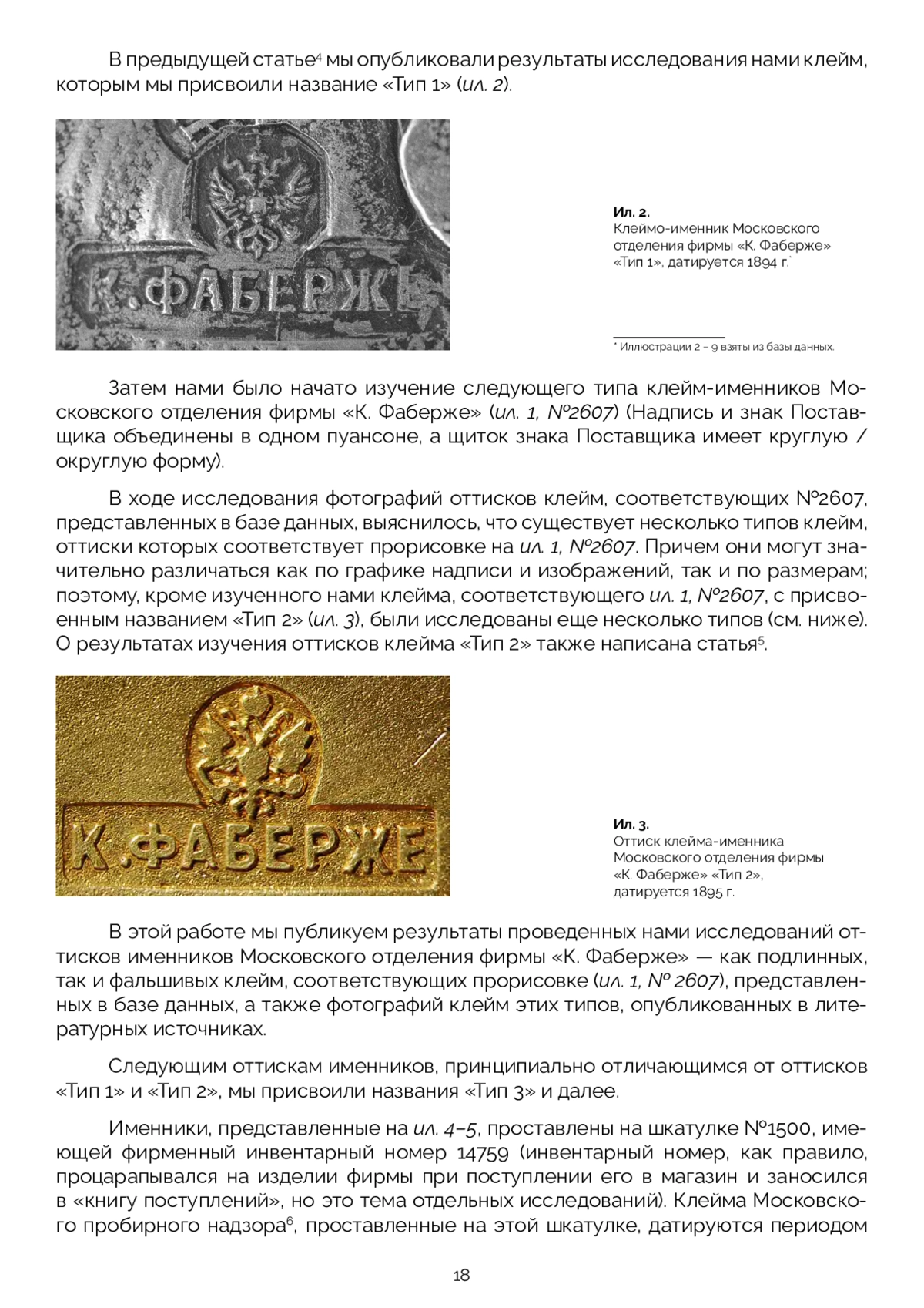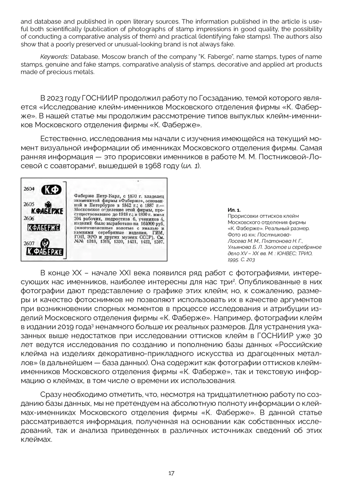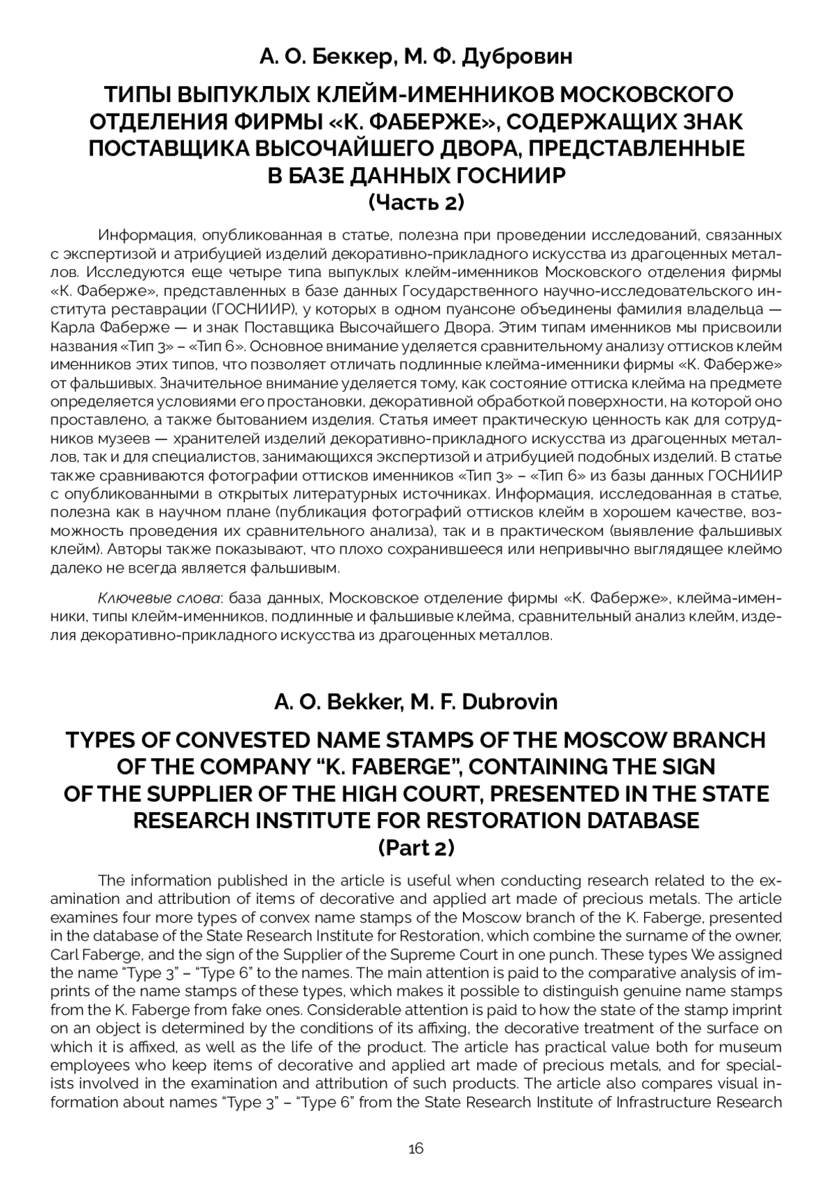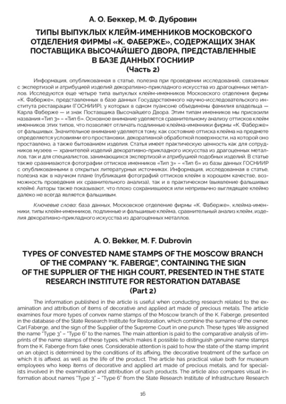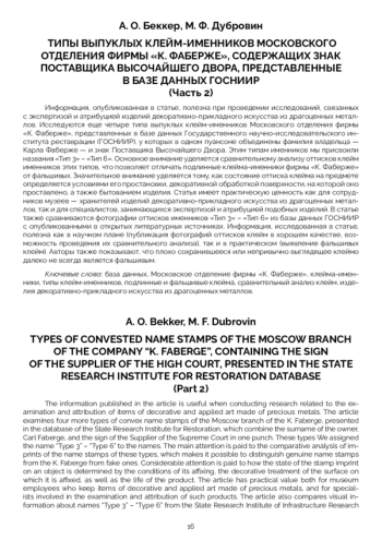 Информация, опубликованная в статье, полезна при проведении исследований, связанных с экспертизой и атрибуцией изделий декоративно-прикладного искусства из драгоценных металлов. Исследуются еще четыре типа выпуклых клейм-именников Московского отделения фирмы «К. Фаберже», представленных в базе данных Государственного научно-исследовательского института реставрации (ГОСНИИР), у которых в одном пуансоне объединены фамилия владельца — Карла Фаберже — и знак Поставщика Высочайшего Двора. Этим типам именников мы присвоили названия «Тип 3» – «Тип 6». Основное внимание уделяется сравнительному анализу оттисков клейм именников этих типов, что позволяет отличать подлинные клейма-именники фирмы «К. Фаберже» от фальшивых. Значительное внимание уделяется тому, как состояние оттиска клейма на предмете определяется условиями его простановки, декоративной обработкой поверхности, на которой оно проставлено, а также бытованием изделия. Статья имеет практическую ценность как для сотрудников музеев — хранителей изделий декоративно-прикладного искусства из драгоценных металлов, так и для специалистов, занимающихся экспертизой и атрибуцией подобных изделий. В статье также сравниваются фотографии оттисков именников «Тип 3» – «Тип 6» из базы данных ГОСНИИР с опубликованными в открытых литературных источниках. Информация, исследованная в статье, полезна как в научном плане (публикация фотографий оттисков клейм в хорошем качестве, возможность проведения их сравнительного анализа), так и в практическом (выявление фальшивых клейм). Авторы также показывают, что плохо сохранившееся или непривычно выглядящее клеймо далеко не всегда является фальшивым.