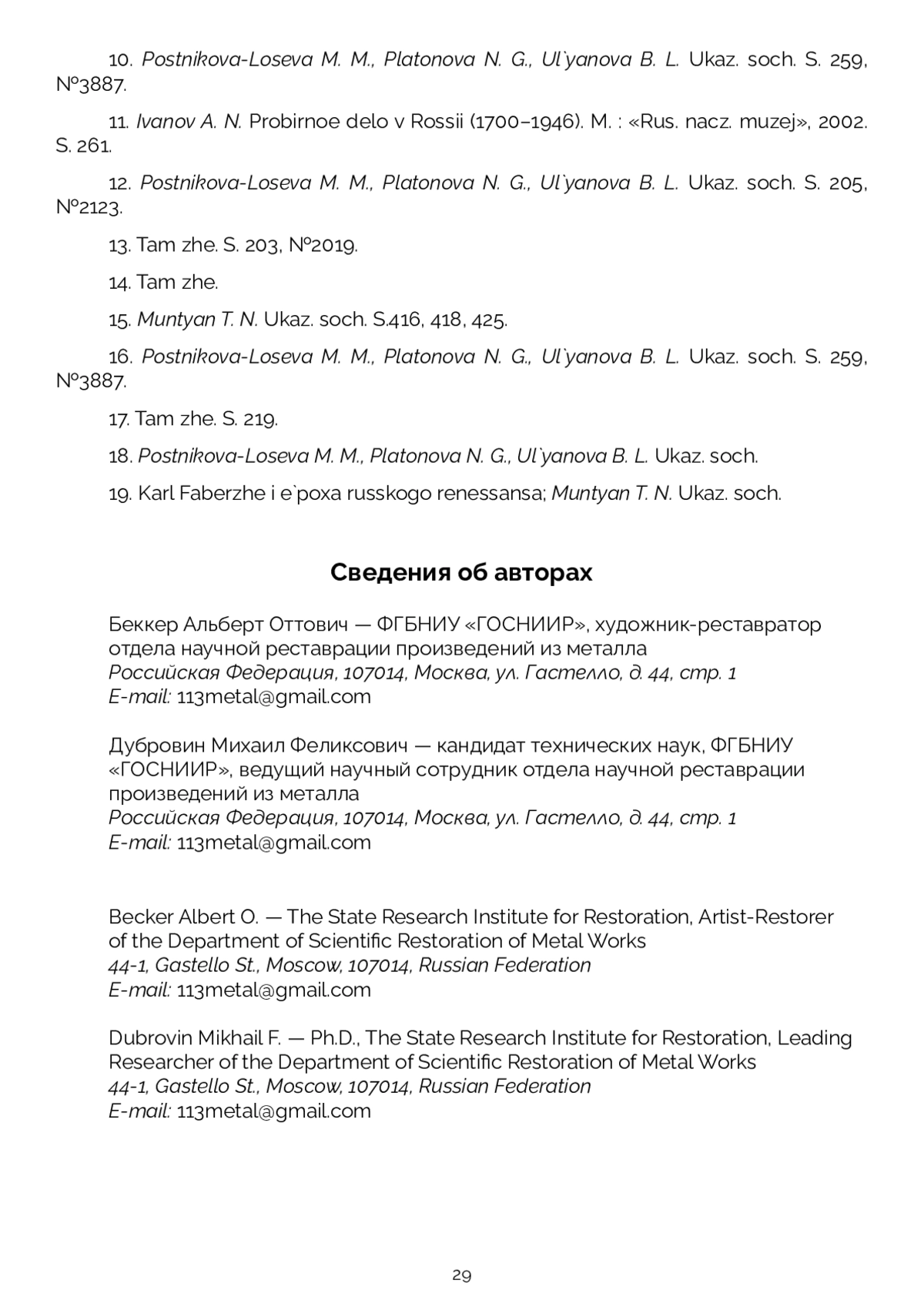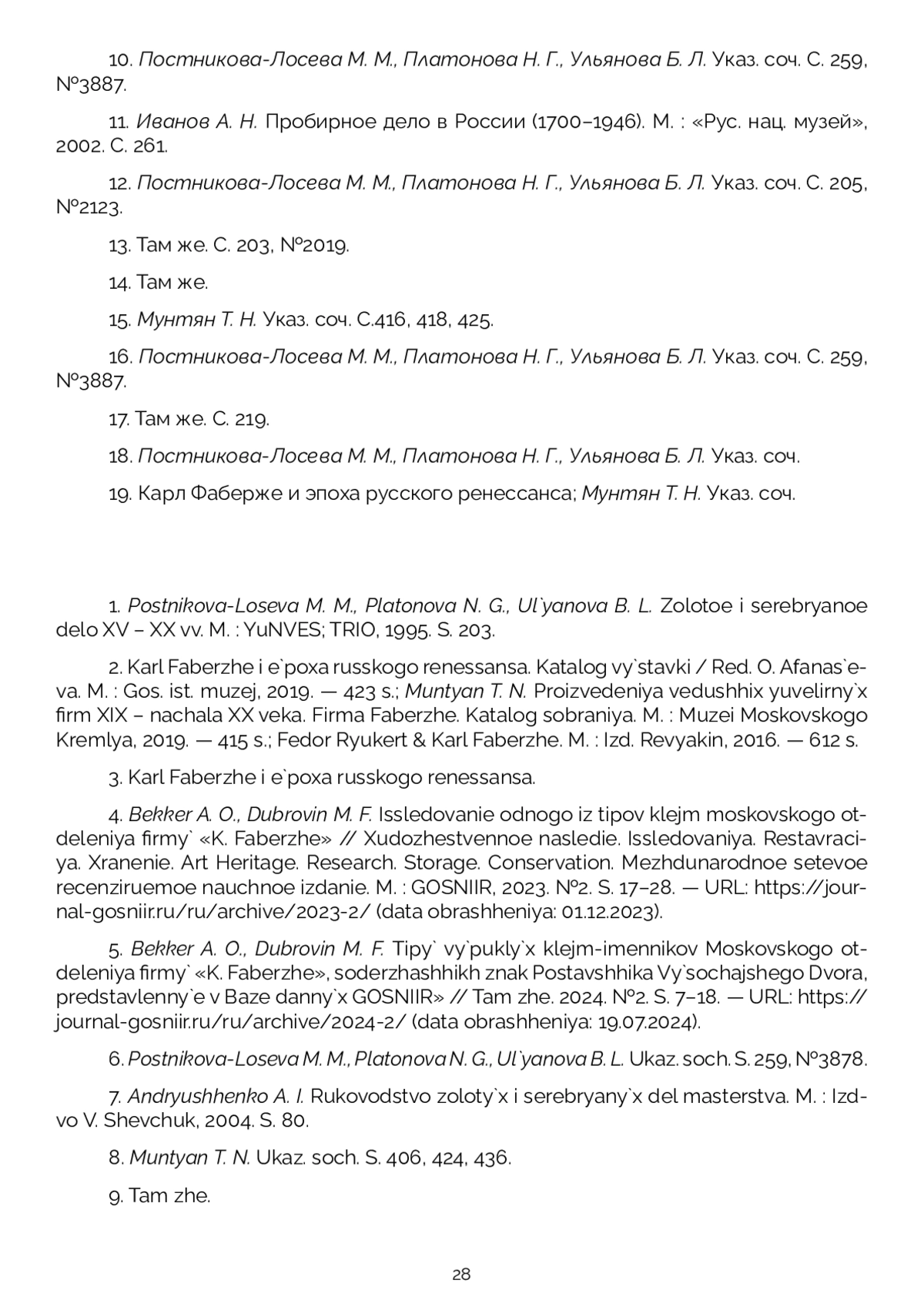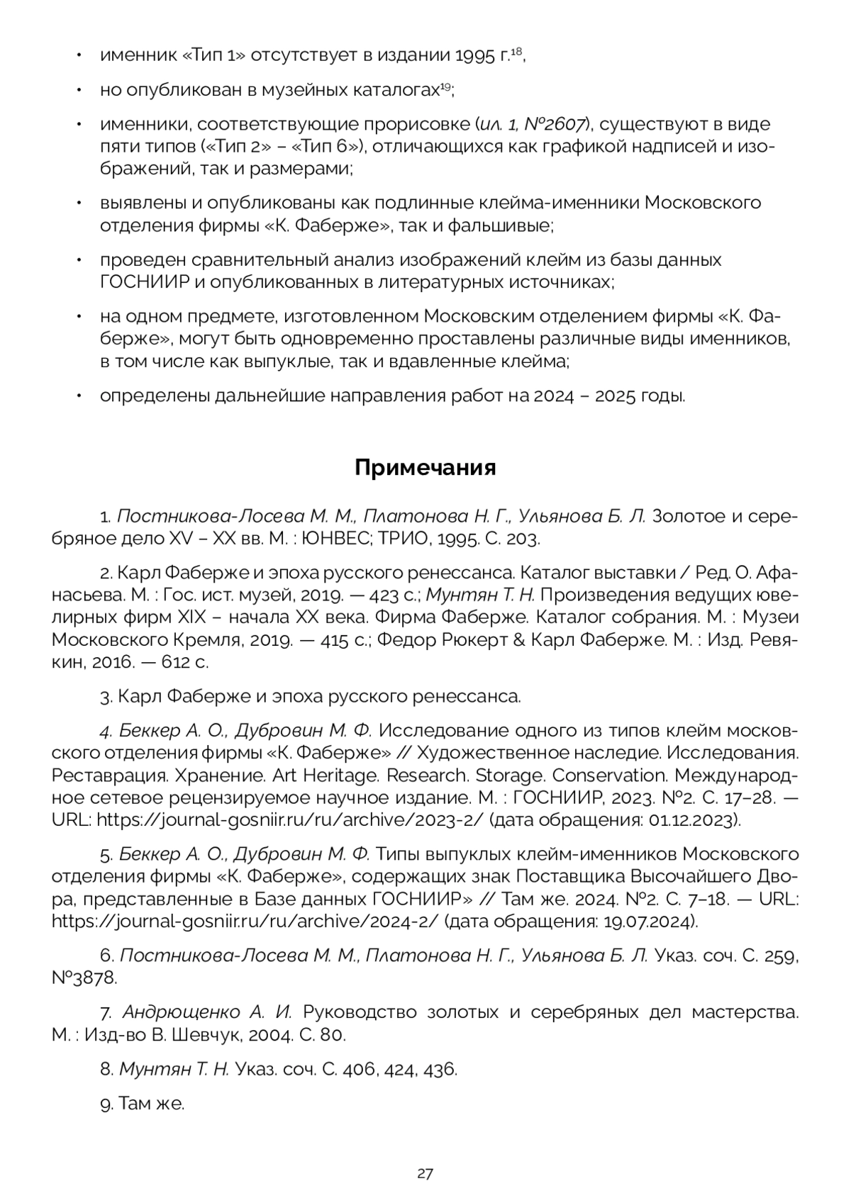 Информация, опубликованная в статье, полезна при проведении исследований, связанных с экспертизой и атрибуцией изделий декоративно-прикладного искусства из драгоценных металлов. Исследуются еще четыре типа выпуклых клейм-именников Московского отделения фирмы «К. Фаберже», представленных в базе данных Государственного научно-исследовательского института реставрации (ГОСНИИР), у которых в одном пуансоне объединены фамилия владельца — Карла Фаберже — и знак Поставщика Высочайшего Двора. Этим типам именников мы присвоили названия «Тип 3» – «Тип 6». Основное внимание уделяется сравнительному анализу оттисков клейм именников этих типов, что позволяет отличать подлинные клейма-именники фирмы «К. Фаберже» от фальшивых. Значительное внимание уделяется тому, как состояние оттиска клейма на предмете определяется условиями его простановки, декоративной обработкой поверхности, на которой оно проставлено, а также бытованием изделия. Статья имеет практическую ценность как для сотрудников музеев — хранителей изделий декоративно-прикладного искусства из драгоценных металлов, так и для специалистов, занимающихся экспертизой и атрибуцией подобных изделий. В статье также сравниваются фотографии оттисков именников «Тип 3» – «Тип 6» из базы данных ГОСНИИР с опубликованными в открытых литературных источниках. Информация, исследованная в статье, полезна как в научном плане (публикация фотографий оттисков клейм в хорошем качестве, возможность проведения их сравнительного анализа), так и в практическом (выявление фальшивых клейм). Авторы также показывают, что плохо сохранившееся или непривычно выглядящее клеймо далеко не всегда является фальшивым.