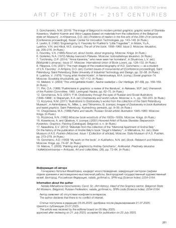 12. Goncharova, N.G. (2001) ‘F.M. Dostoevsky through the eyes of Russian and Soviet illustrators: (1848–1988)’, in Stepanyan, K.A. (ed.) Dostoevsky and world culture. Moscow: s. n., pp. 192–223. (In Russ.)
