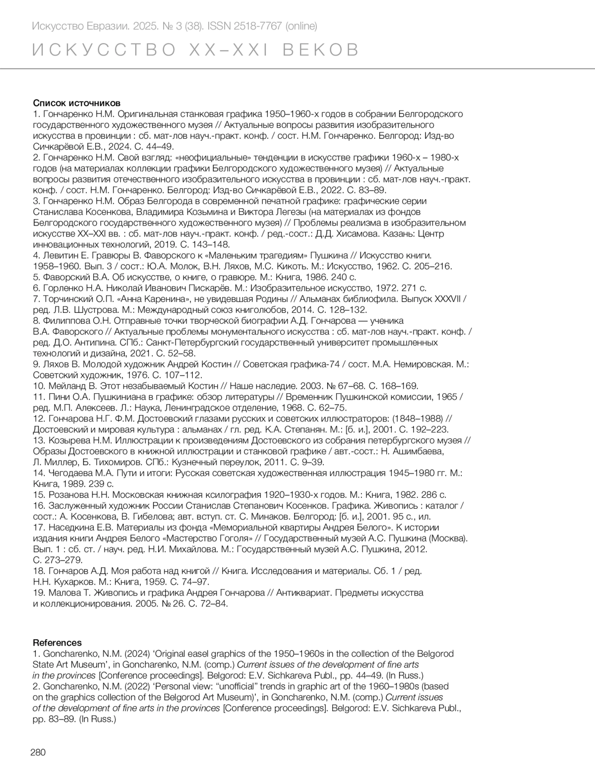 1. Goncharenko, N.M. (2024) ‘Original easel graphics of the 1950–1960s in the collection of the Belgorod State Art Museum’, in Goncharenko, N.M. (comp.) Current issues of the development of fine arts in the provinces [Conference proceedings]. Belgorod: E.V. Sichkareva Publ., pp. 44–49. (In Russ.)