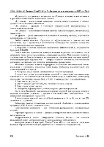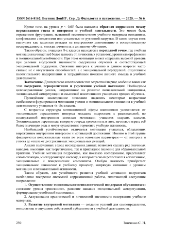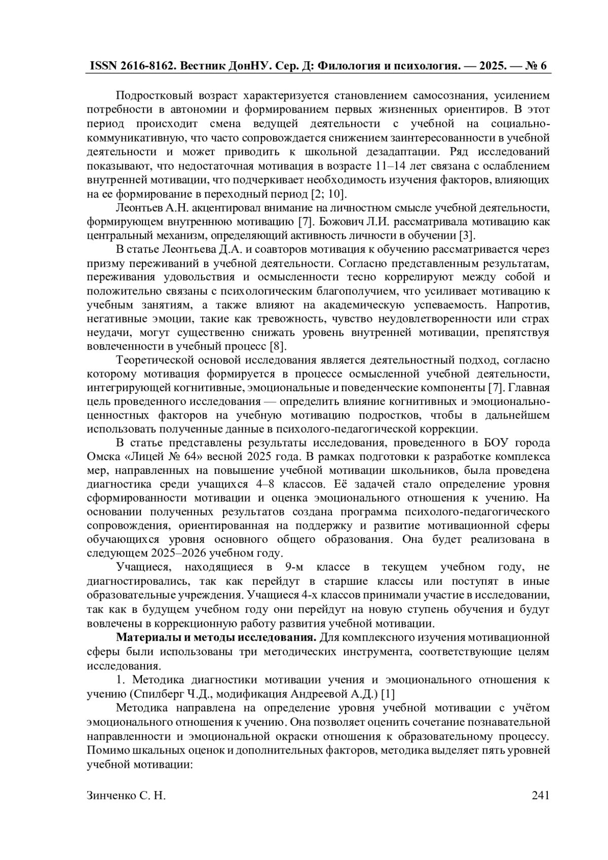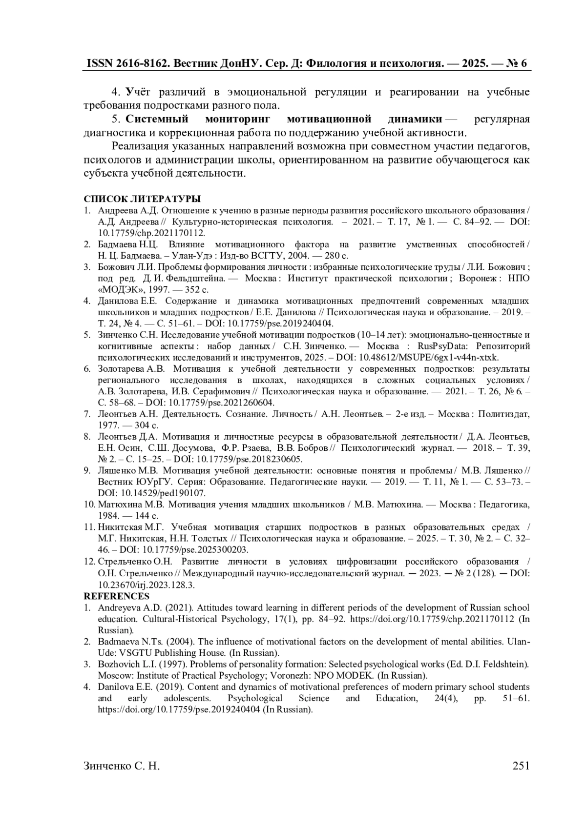 5. Зинченко С.Н. Исследование учебной мотивации подростков (10-14 лет): эмоционально-ценностные и когнитивные аспекты: набор данных / С.Н. Зинченко. - Москва: RusPsyData: Репозиторий психологических исследований и инструментов, 2025. -. DOI: 10.48612/MSUPE/6gx1-v44n-xtxk