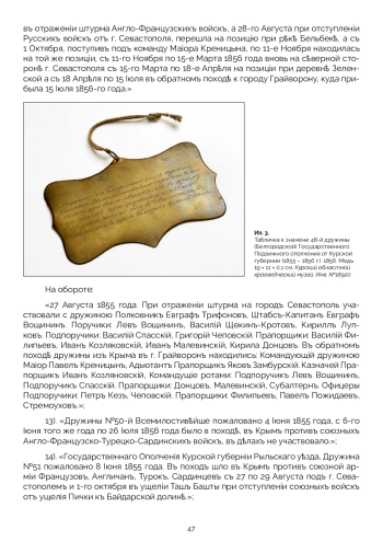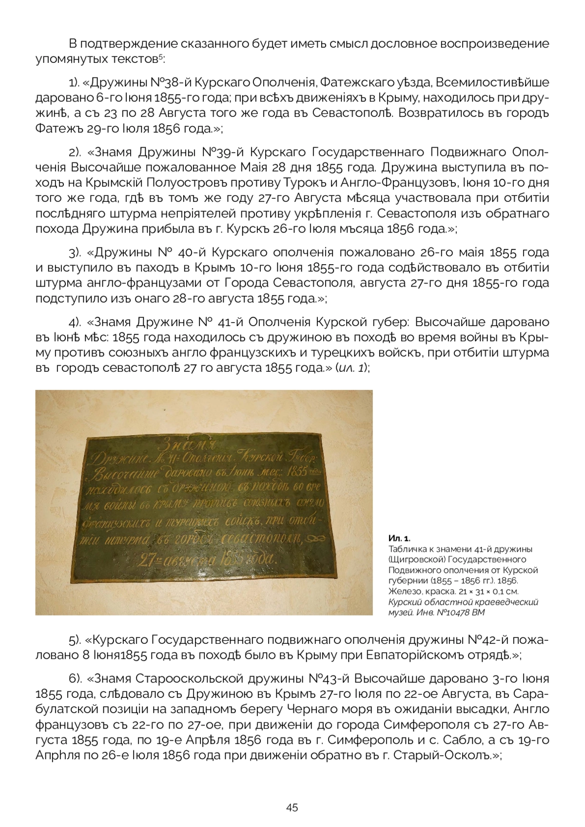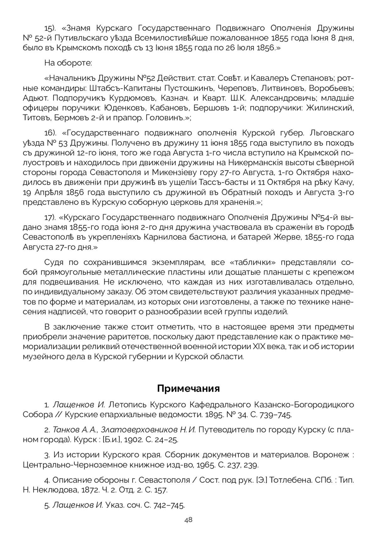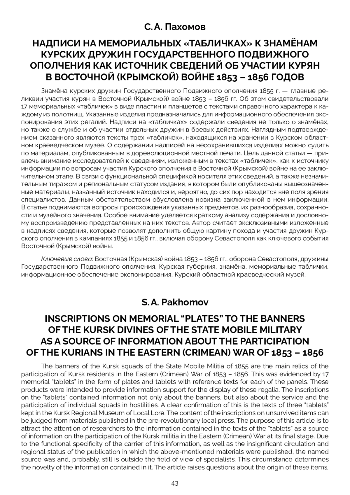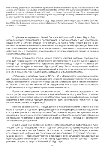 Знамёна курских дружин Государственного Подвижного ополчения 1855 г. — главные реликвии участия курян в Восточной (Крымской) войне 1853 – 1856 гг. Об этом свидетельствовали 17 мемориальных «табличек» в виде пластин и планшетов с текстами справочного характера к каждому из полотнищ. Указанные изделия предназначались для информационного обеспечения экспонирования этих регалий. Надписи на «табличках» содержали сведения не только о знамёнах, но также о службе и об участии отдельных дружин в боевых действиях. Наглядным подтверждением сказанного являются тексты трех «табличек», находящихся на хранении в Курском областном краеведческом музее. О содержании надписей на несохранившихся изделиях можно судить по материалам, опубликованным в дореволюционной местной печати. Цель данной статьи — привлечь внимание исследователей к сведениям, изложенным в текстах «табличек», как к источнику информации по вопросам участия Курского ополчения в Восточной (Крымской) войне на ее заключительном этапе. В связи с функциональной спецификой носителя этих сведений, а также незначительным тиражом и региональным статусом издания, в котором были опубликованы вышеозначенные материалы, названный источник находился и, вероятно, до сих пор находится вне поля зрения специалистов. Данным обстоятельством обусловлена новизна заключенной в нем информации. В статье поднимаются вопросы происхождения указанных предметов, их разнообразия, сохранности и музейного значения. Особое внимание уделяется краткому анализу содержания и дословному воспроизведению представленных на них текстов. Автор считает эксклюзивными изложенные в надписях сведения, которые позволят дополнить общую картину похода и участия дружин Курского ополчения в кампаниях 1855 и 1856 гг., включая оборону Севастополя как ключевого события Восточной (Крымской) войны.