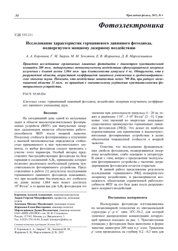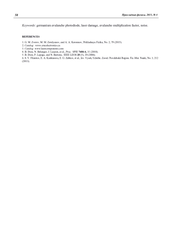 А. А. Koronnov, G. M. Zverev, М. М. Zemlyanov, E. V. Zharicova, and D. V. Marsagishvili Characteristics of the germanium avalanche photodiode subjected to a high power laser irradiation 54