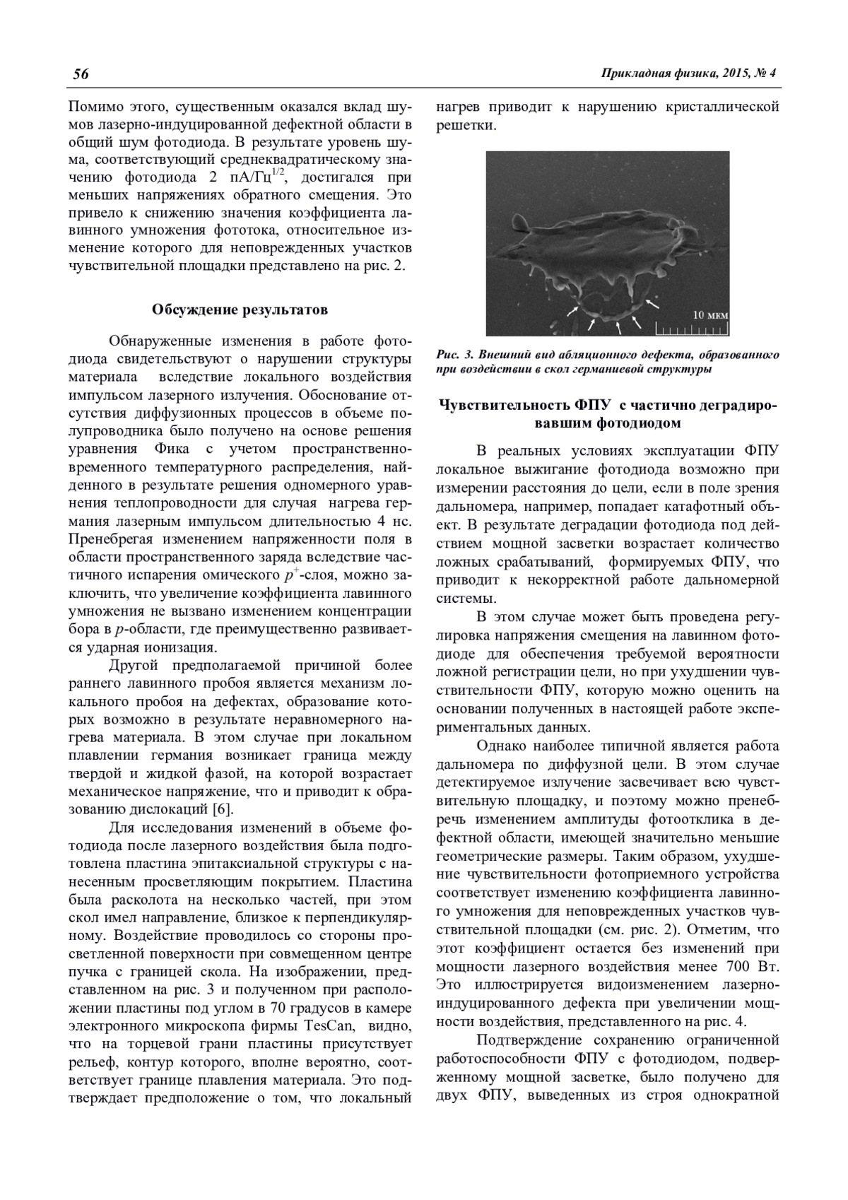 Экспериментально обнаружено, что вследствие воздействия лазерного излучения с плотностью мощности, превышающей порог плавления материала, в структуре германиевых лавинных фотодиодов формируются необратимые дефекты, для которых свойственно более раннее развитие процесса лавинного умножения. Исследование объемной структуры абляционных кратеров показало, что изменения в работе p–n-перехода происходят вследствие нарушения кристаллической решетки на границе между твердой и жидкой фазой, формируемой при лазерном нагреве материала.