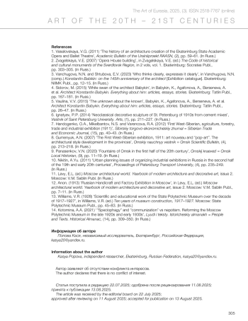 5. Vaulina, V.V. (2015) ‘The unknown about the known’, in Babykin, K., Agafonova, A., Berseneva, A. et al. Architect Konstantin Babykin. Everything about him: articles, essays, stories. Ekaterinburg: Tatlin Publ., pp. 26–47. (In Russ.)