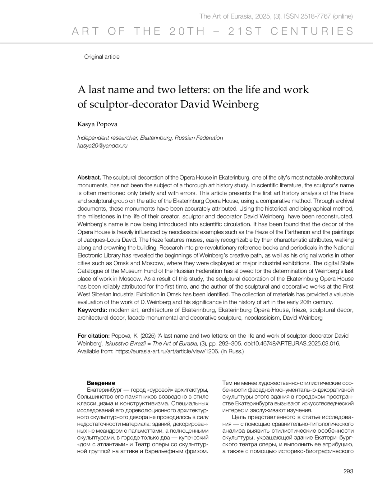Попова К. Фамилия и две буквы: о жизни и творчестве скульптора-декоратора Давида Вейнберга // Искусство Евразии [Электронный журнал]. 2025. No 3 (38). С. 292–305.
