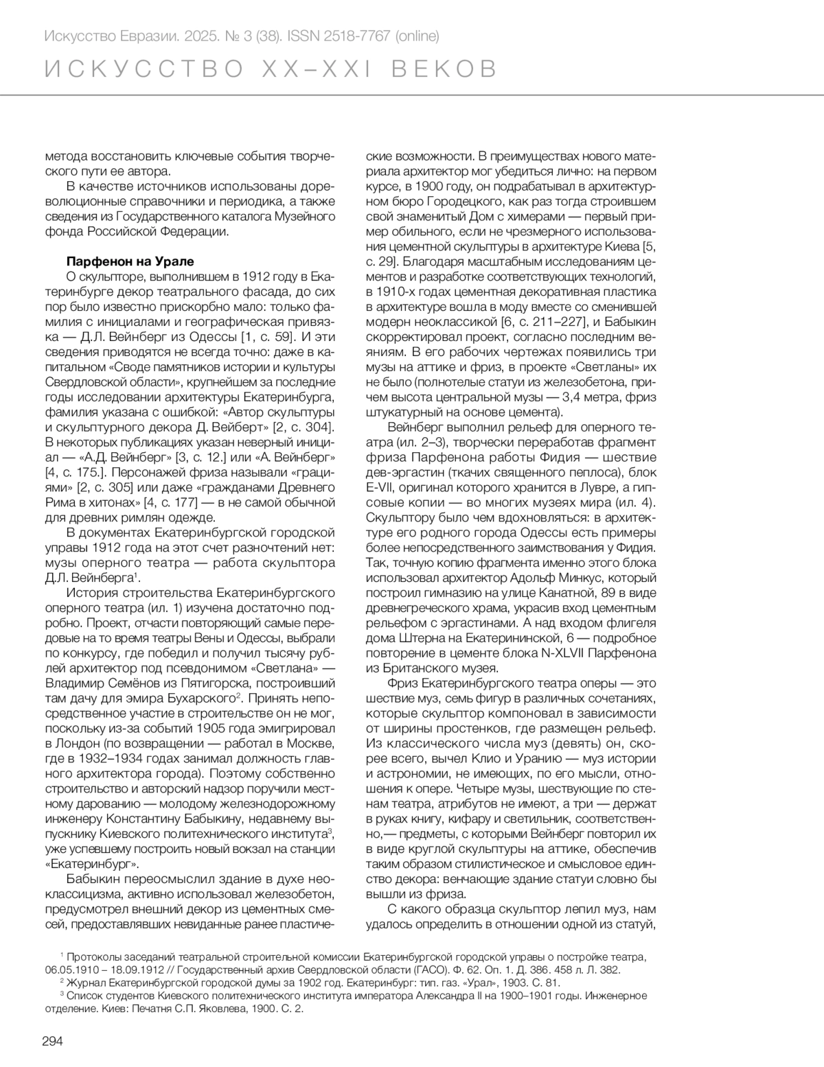 The sculptural decoration of the Opera House in Ekaterinburg, one of the city’s most notable architectural monuments, has not been the subject of a thorough art history study. In scientific literature, the sculptor’s name is often mentioned only briefly and with errors. This article presents the first art history analysis of the frieze and sculptural group on the attic of the Ekaterinburg Opera House, using a comparative method. Through archival documents, these monuments have been accurately attributed. Using the historical and biographical method, the milestones in the life of their creator, sculptor and decorator David Weinberg, have been reconstructed. Weinberg’s name is now being introduced into scientific circulation. It has been found that the decor of the Opera House is heavily influenced by neoclassical examples such as the frieze of the Parthenon and the paintings of Jacques-Louis David. The frieze features muses, easily recognizable by their characteristic attributes, walking along and crowning the building. Research into pre-revolutionary reference books and periodicals in the National Electronic Library has revealed the beginnings of Weinberg’s creative path, as well as his original works in other cities such as Omsk and Moscow, where they were displayed at major industrial exhibitions. The digital State Catalogue of the Museum Fund of the Russian Federation has allowed for the determination of Weinberg’s last place of work in Moscow. As a result of this study, the sculptural decoration of the Ekaterinburg Opera House has been reliably attributed for the first time, and the author of the sculptural and decorative works at the First West Siberian Industrial Exhibition in Omsk has been identified. The collection of materials has provided a valuable evaluation of the work of D. Weinberg and his significance in the history of art in the early 20th century.