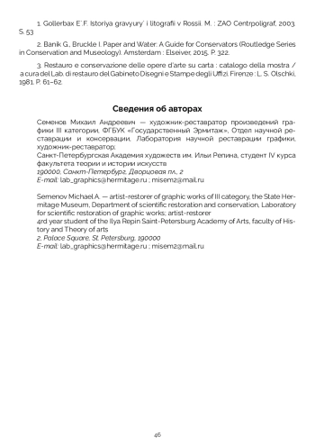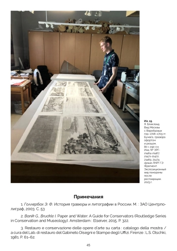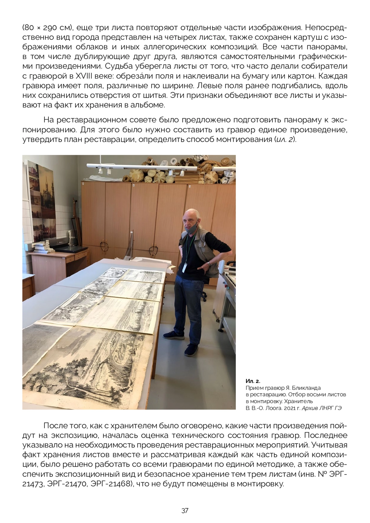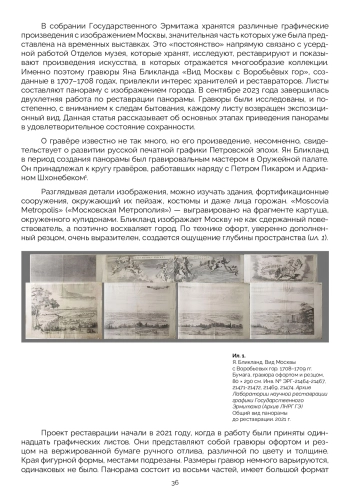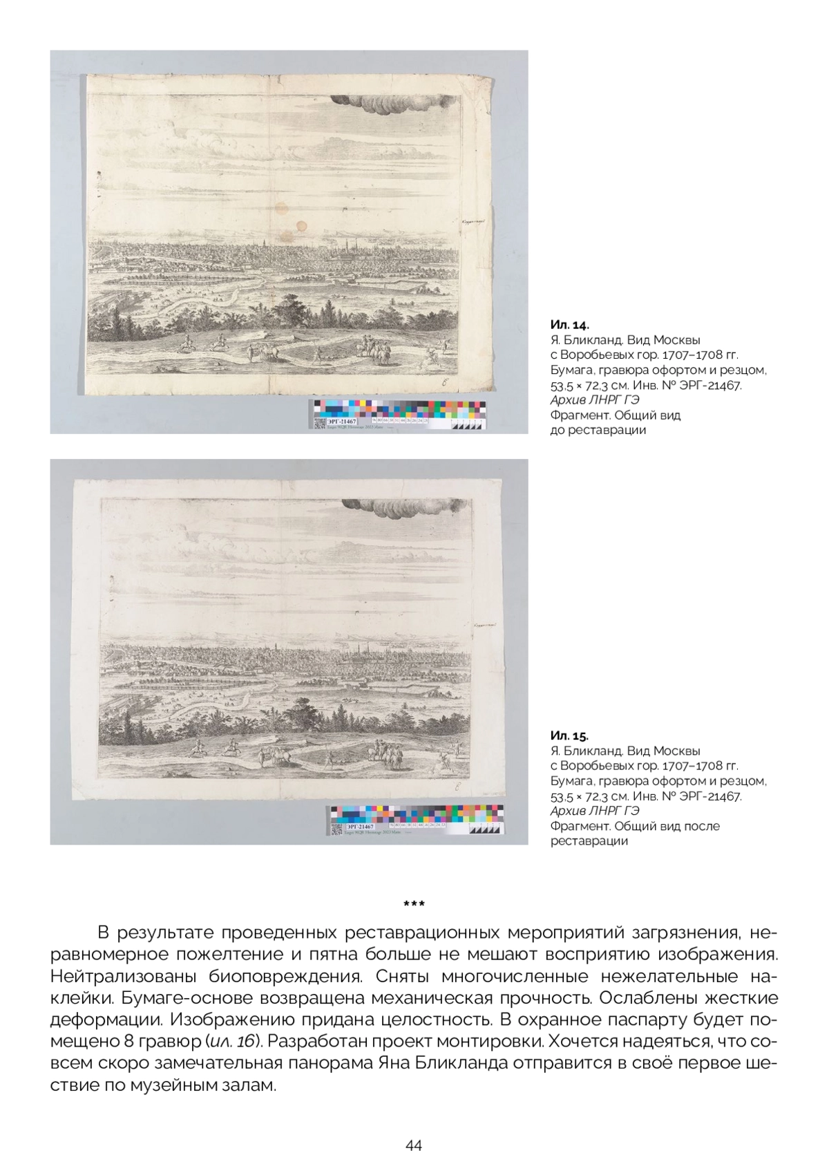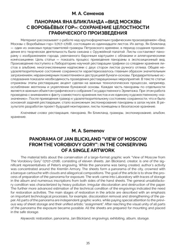 Материал рассказывает о работе над крупноформатным графическим произведением «Вид Москвы с Воробьёвых гор» (1707–1708), состоящим из одиннадцати листов. Их автор, Ян Бликланд — один из знаковых представителей гравюры Петровского времени, в период создания произведения его творческая деятельность была связана с Оружейной палатой. Листы составляют панораму с изображением города, увенчанного барочным картушем с облаками и аллегорическими композициями. Цель статьи — показать процесс приведения панорамы в экспозиционный вид. Произведение поступило в Лабораторию научной реставрации графики со следами хранения листов в альбоме, многочисленными надписями с двух сторон листов ручного отлива. Общее неудовлетворительное состояние сохранности характеризовалось главным образом значительным загрязнением, неравномерным пожелтением и деструкцией бумаги-основы. Предварительные исследования показали необходимость проведения реставрационных мероприятий. В тексте статьи отражены этапы реставрации; акцент сделан на важных технологических процессах, например, ослаблении желтизны и укреплении бумажной основы. Каждая часть панорамы по отдельности является важным объектом графического собрания Государственного Эрмитажа. При этом работа проведена с вниманием к факту совместного хранения листов и их единому художественному «назначению». После приведения гравюр к удовлетворительному состоянию сохранности, что и было основной задачей реставрации, стало возможным экспонирование панорамы в залах музея. В результате разработан проект будущей монтировки, листы помещены в безопасное хранение.