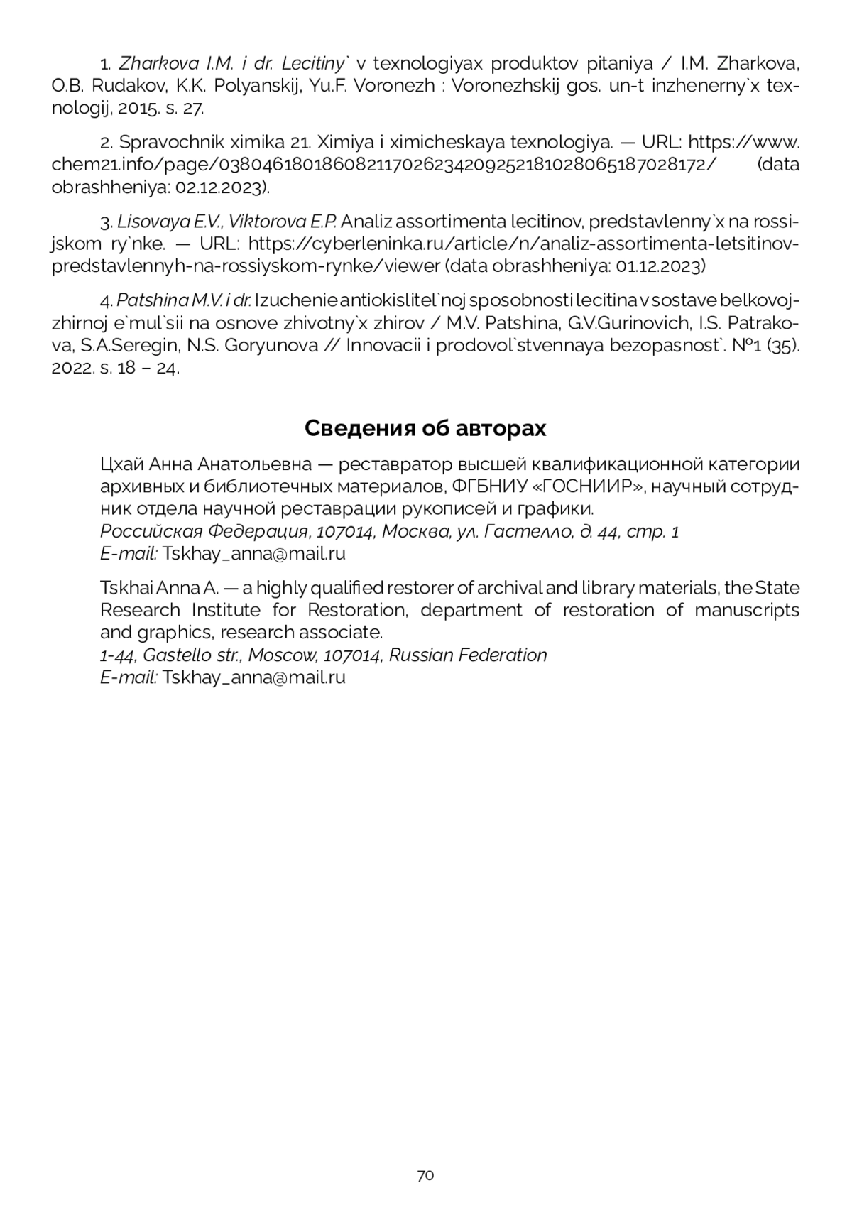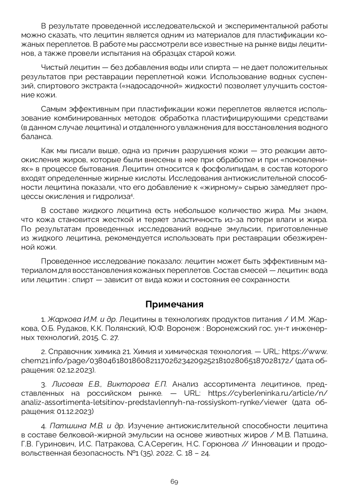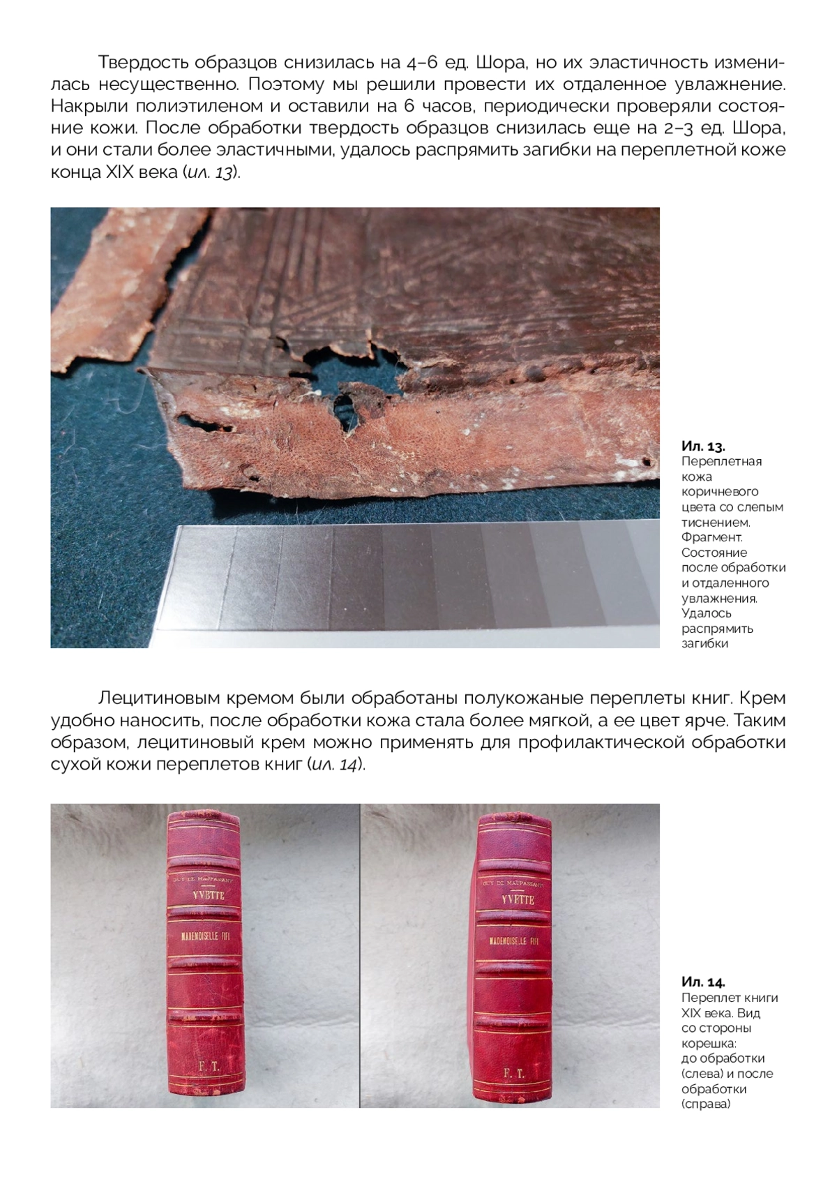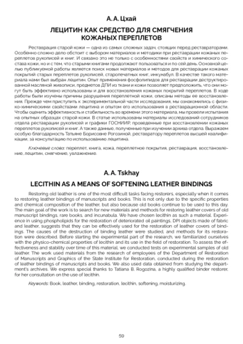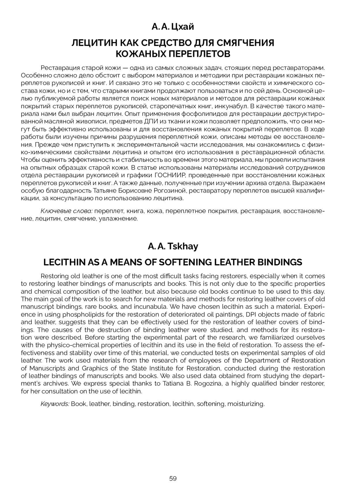 Реставрация старой кожи — одна из самых сложных задач, стоящих перед реставраторами. Особенно сложно дело обстоит с выбором материалов и методики при реставрации кожаных переплетов рукописей и книг. И связано это не только с особенностями свойств и химического состава кожи, но и с тем, что старыми книгами продолжают пользоваться и по сей день. Основной целью публикуемой работы является поиск новых материалов и методов для реставрации кожаных покрытий старых переплетов рукописей, старопечатных книг, инкунабул. В качестве такого материала нами был выбран лецитин. Опыт применения фосфолипидов для реставрации деструктированной масляной живописи, предметов ДПИ из ткани и кожи позволяет предположить, что они могут быть эффективно использованы и для восстановления кожаных покрытий переплетов. В ходе работы были изучены причины разрушения переплетной кожи, описаны методы ее восстановления. Прежде чем приступить к экспериментальной части исследования, мы ознакомились с физико-химическими свойствами лецитина и опытом его использования в реставрационной области. Чтобы оценить эффективность и стабильность во времени этого материала, мы провели испытания на опытных образцах старой кожи. В статье использованы материалы исследований сотрудников отдела реставрации рукописей и графики ГОСНИИР, проведенные при восстановлении кожаных переплетов рукописей и книг. А также данные, полученные при изучении архива отдела. Выражаем особую благодарность Татьяне Борисовне Рогозиной, реставратору переплетов высшей квалификации, за консультацию по использованию лецитина.