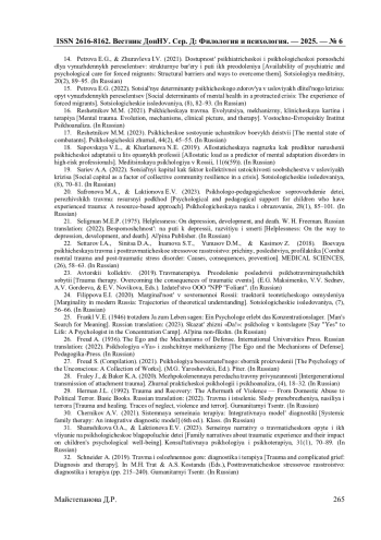 14. Петрова Е.Г. Доступность психиатрической и психологической помощи для вынужденных переселенцев: структурные барьеры и пути их преодоления / Е.Г. Петрова, И.В. Журавлева // Социология медицины. - 2021. - Т. 20, № 2. - С. 89-95.