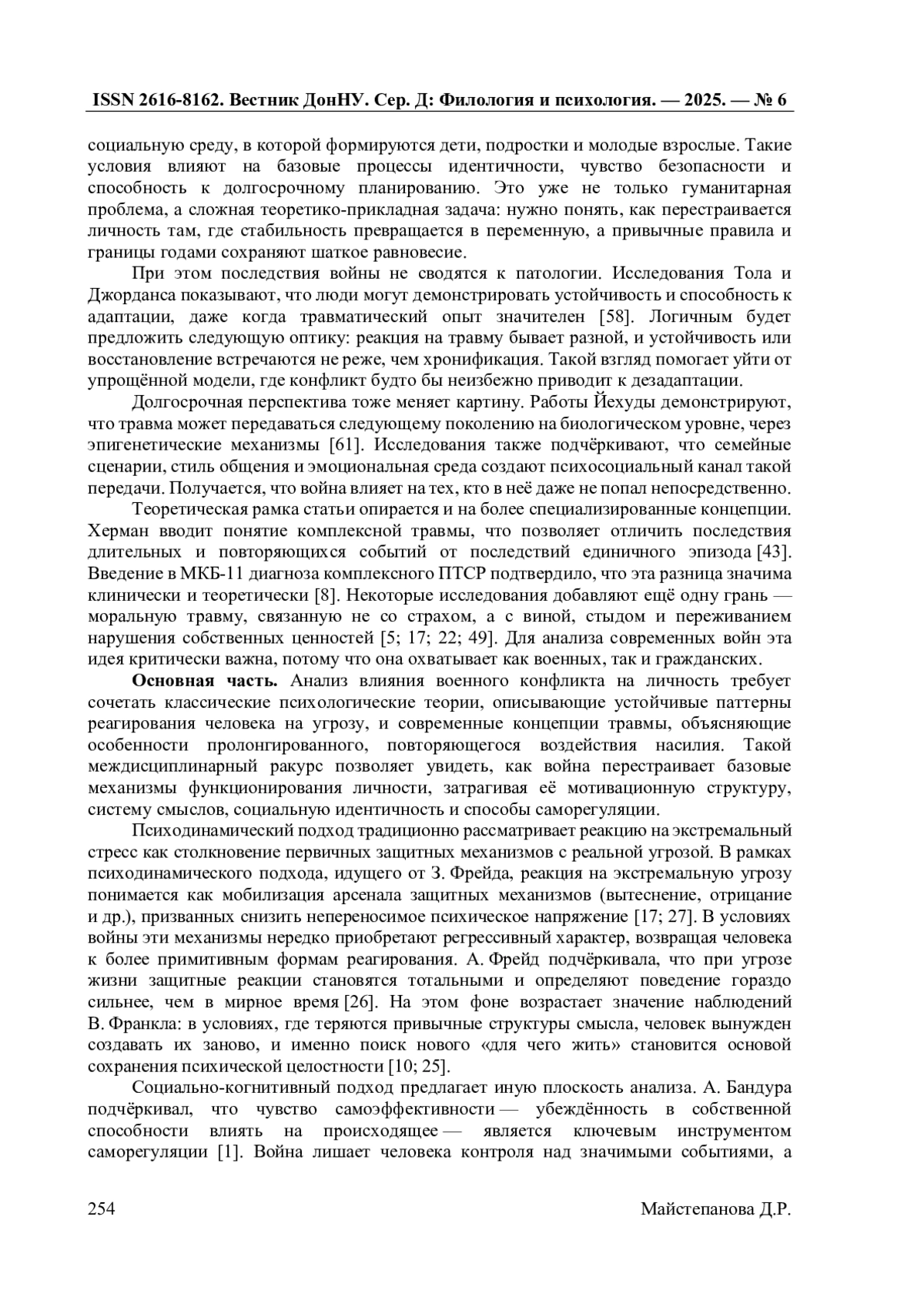 Основной результат заключается в раскрытии диалектики этого воздействия: наряду с рисками дезинтеграции, война актуализирует потенциал резильентности и посттравматического роста. Доказывается, что эффективная помощь требует интеграции клинических интервенций с мерами социальной политики, учитывающими фазу конфликта и многоуровневую природу факторов устойчивости.