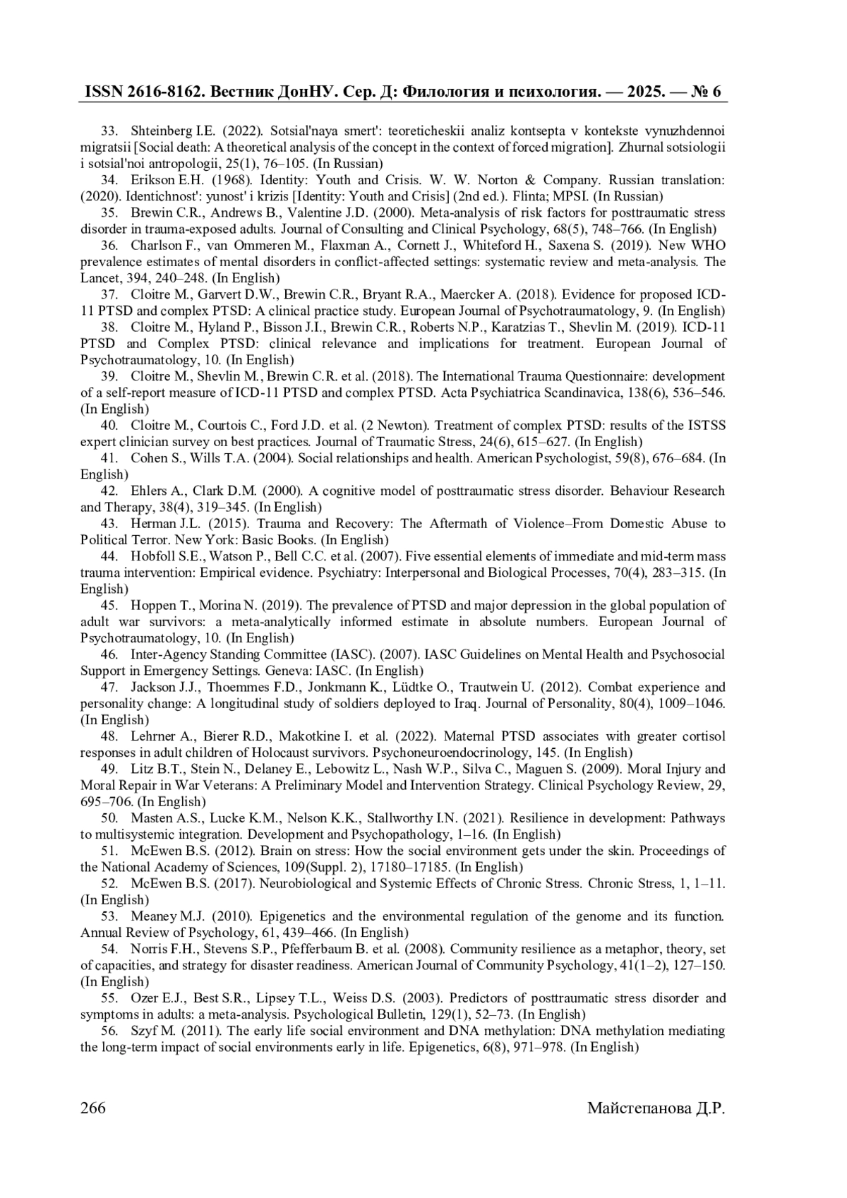 6. Гриценко В.В. Социально-психологическая адаптация вынужденных мигрантов в России: проблемы и перспективы / В.В. Гриценко, А.В. Лепшокова // Национальный психологический журнал. - 2021. - № 2(42). - С. 15-28.
