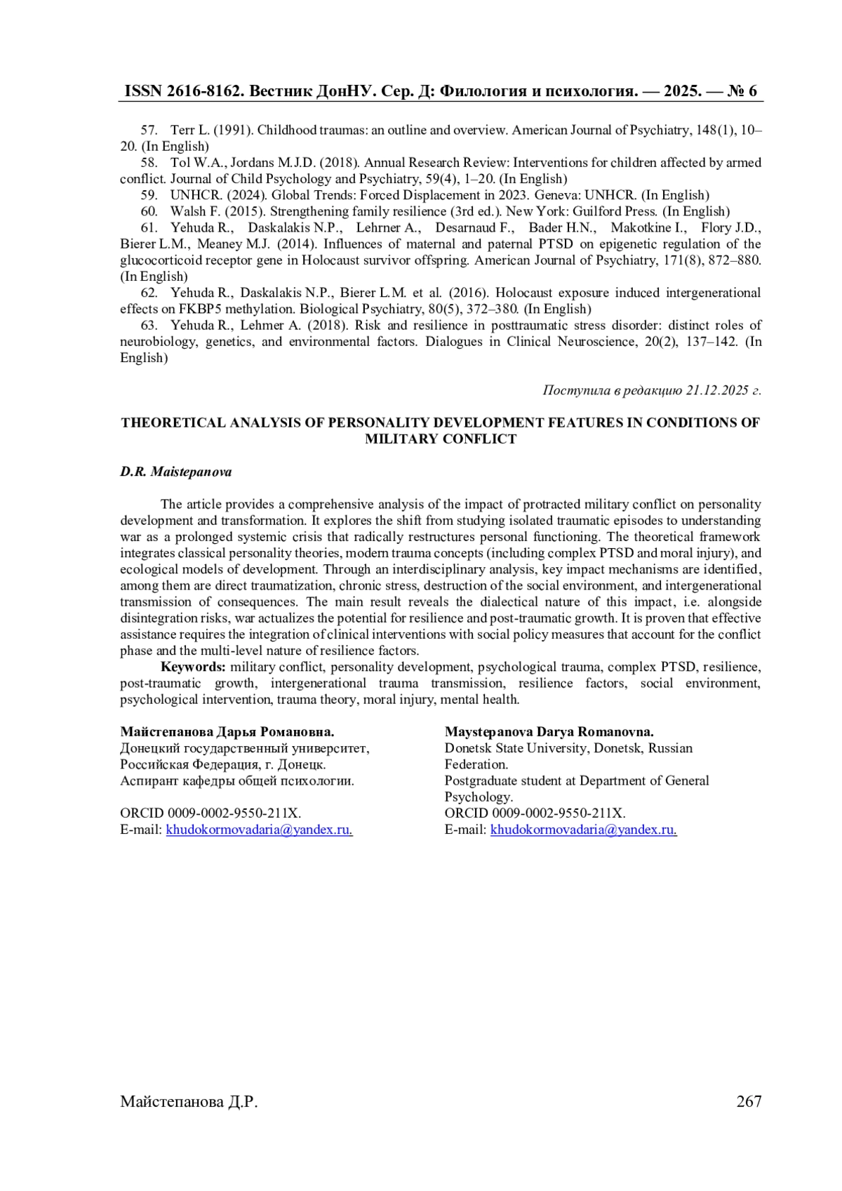 63. Yehuda R. Risk and resilience in posttraumatic stress disorder: distinct roles of neurobiology, genetics, and environmental factors / R. Yehuda, A. Lehmer // Dialogues in Clinical Neuroscience. - 2018. - Vol. 20, № 2. - P. 137-142.