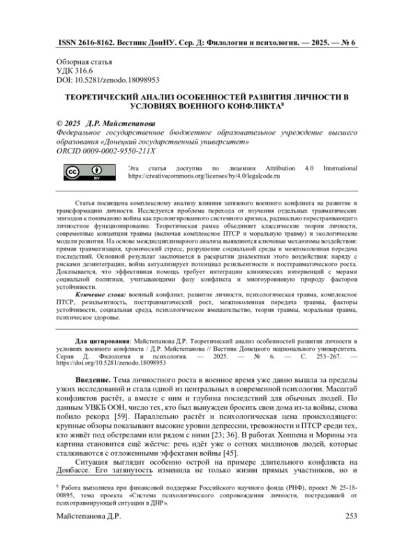 Статья посвящена комплексному анализу влияния затяжного военного конфликта на развитие и трансформацию личности. Исследуется проблема перехода от изучения отдельных травматических эпизодов к пониманию войны как пролонгированного системного кризиса, радикально перестраивающего личностное функционирование. Теоретическая рамка объединяет классические теории личности, современные концепции травмы (включая комплексное ПТСР и моральную травму) и экологические модели развития. На основе междисциплинарного анализа выявляются ключевые механизмы воздействия: прямая травматизация, хронический стресс, разрушение социальной среды и межпоколенная передача последствий.