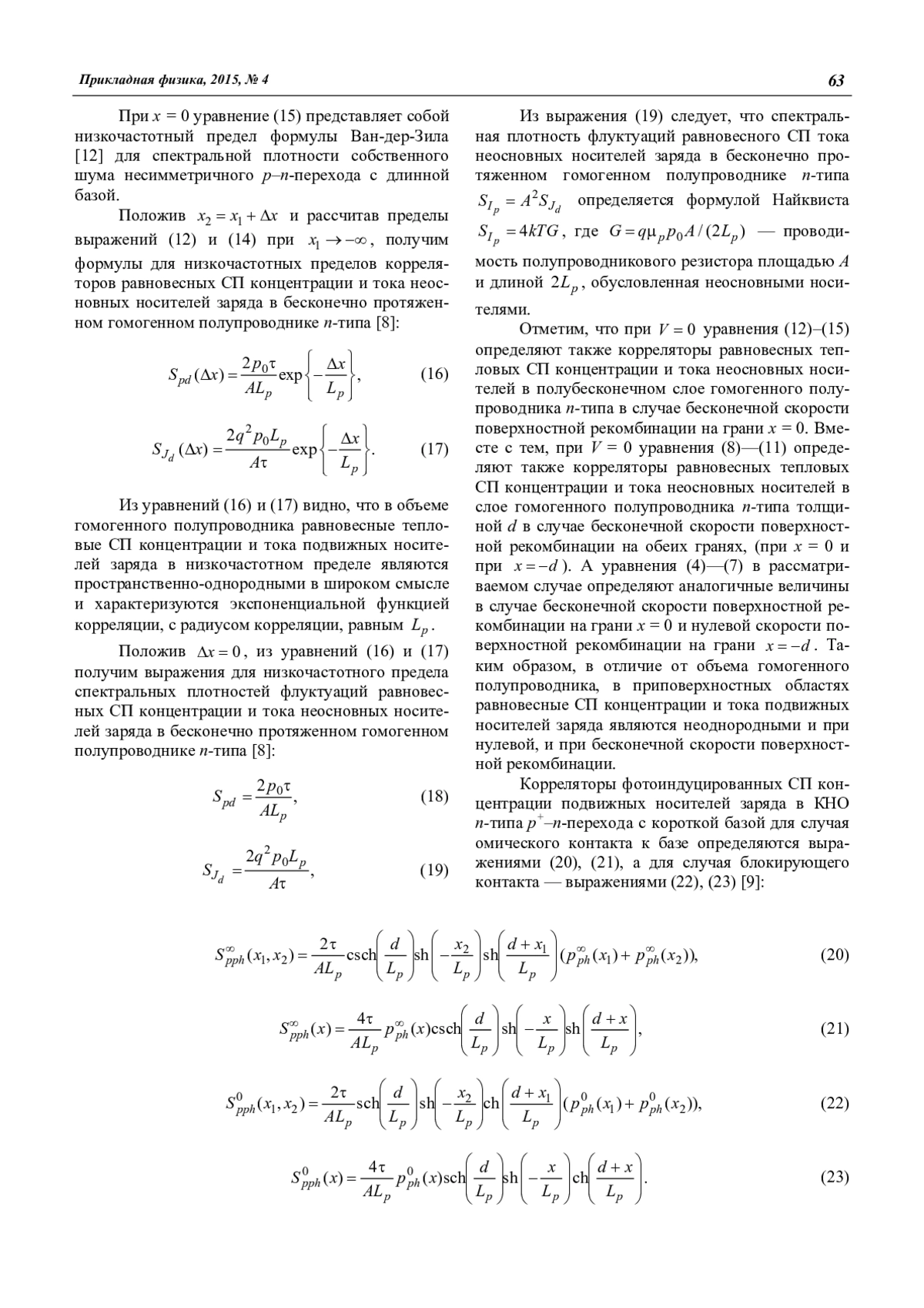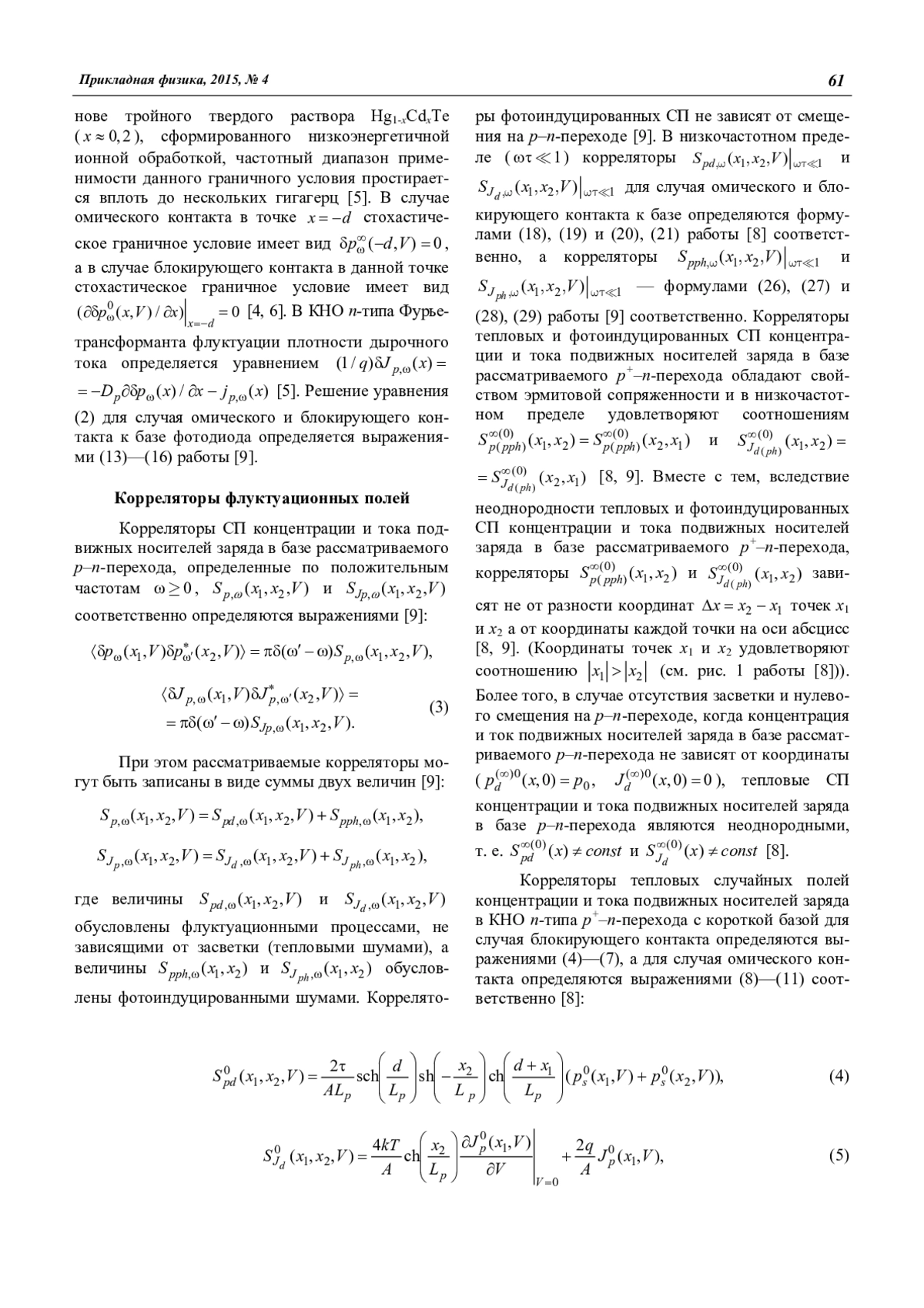 Проведен сравнительный анализ корреляционных свойств стационарных тепловых и фотоиндуцированных СП концентраций и токов подвижных носителей заряда в ИК-фотодиодах и гомогенных полупроводниках в низкочастотном пределе (1). Показано, что стационарные тепловые и фотоиндуцированные СП концентраций подвижных носителей заряда в базе p–n-перехода имеют одинаковые корреляционные свойства. В то же время корреляционные свойства стационарных СП диффузионного тока и фототока в базе p–n-перехода одинаковы только при выполнении определенных условий. Установлено, что в объеме гомогенного полупроводника равновесные тепловые СП концентрации и тока подвижных носителей заряда в низкочастотном пределе являются пространственно-однородными в широком смысле и характеризуются экспоненциальной функцией корреляции, с радиусом корреляции, равным Lp. В тоже время, в отличие от объемной области, в приповерхностных областях гомогенного полупроводника равновесные СП концентрации и тока подвижных носителей заряда являются неоднородными и при нулевой, и при бесконечной скорости поверхностной рекомбинации.