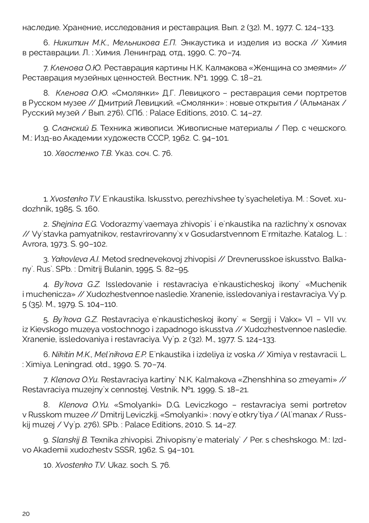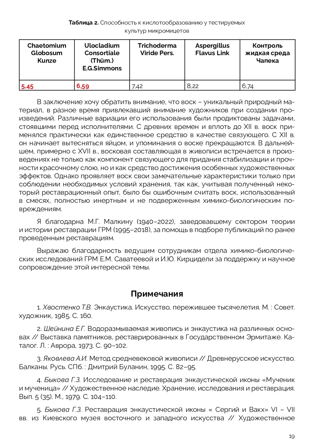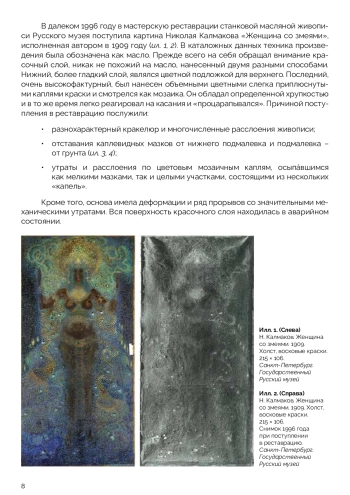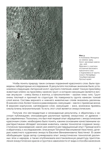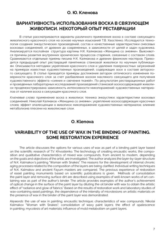 В статье рассматриваются варианты различного применения воска в составе связующего живописного красочного слоя на основе научных изысканий Т. В. Хвостенко. Исследуются технология создания энкаустических произведений, состав и качественные характеристики смесевых восковых соединений, от древних до современных, в зависимости от целей и задач художника. Анализируется послойная структура картины Н. К. Калмакова «Женщина со змеями». Выясняются причины развития внутренних хронических процессов старения, связанные с составом слоев. Сравниваются отдельные приемы письма Н. К. Калмакова и древних фаюмских мастеров. Приводится предыдущий опыт реставраций памятников станковой живописи по научным публикациям. Описываются методики укрепления красочного слоя и удаления поверхностных загрязнений на примерах известных художественных произведений, содержащих воск в составе авторского связующего. В статье приводятся примеры достижения автором оптического изменения поверхности красочного слоя за счет разбавления воском масляного связующего для получения художественного эффекта «сияния и свечения тканей». По результатам реставрационных работ и проведенных лабораторных исследований произведений станковой воскосодержащей живописи продемонстрирована зависимость интенсивности микопоражений художественных материалов от наличия воска в связующем красочного слоя.