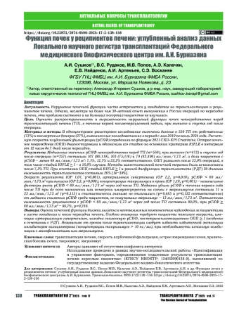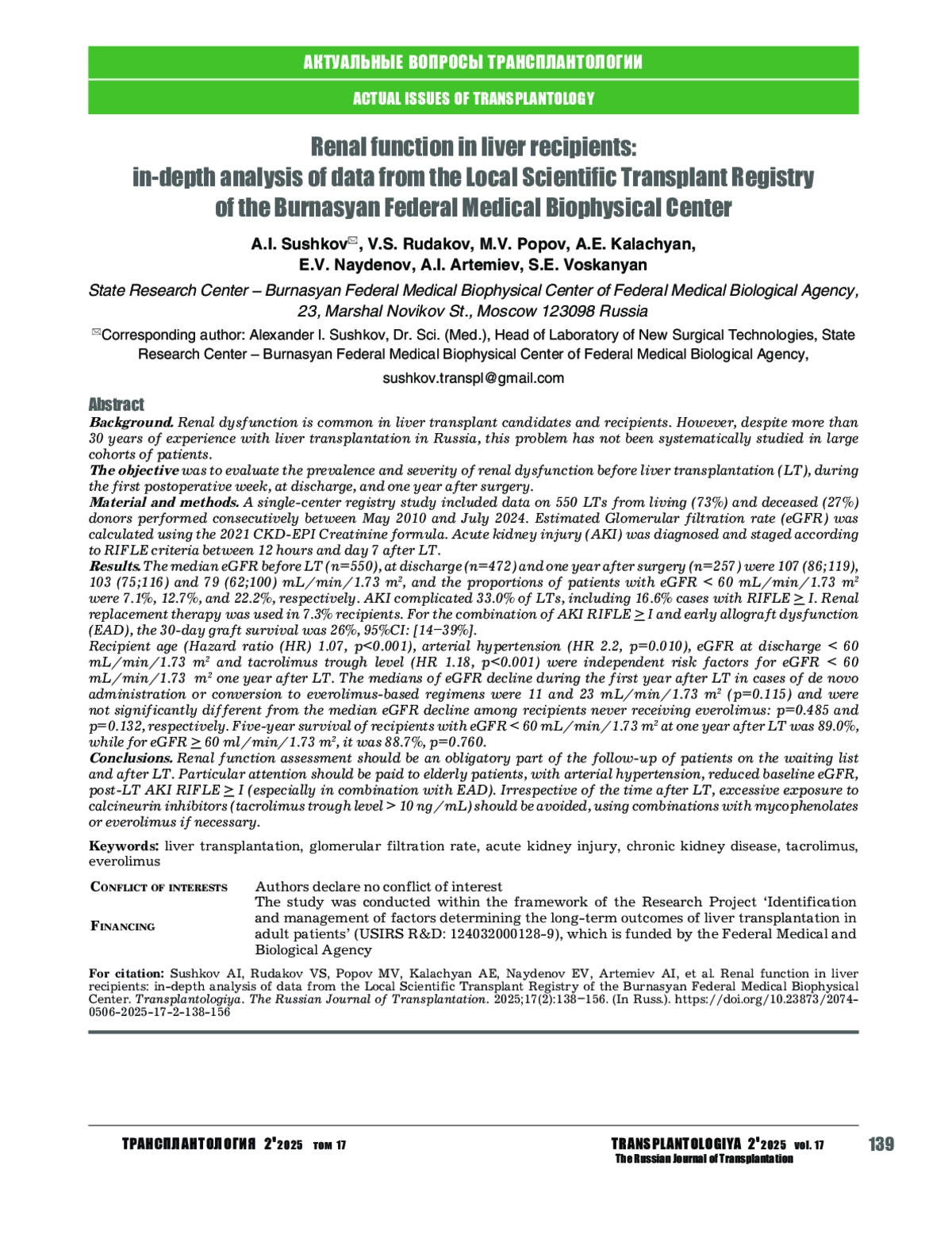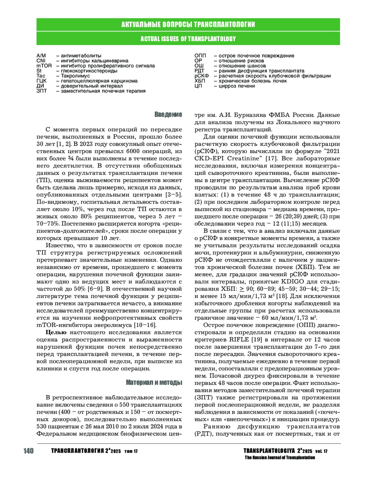 Выводы. Оценка почечной функции должна являться неотъемлемым компонентом наблюдения за пациентами в листе ожидания и после пересадки печени. Особого внимания требуют пациенты пожилого возраста, имеющие артериальную гипертензию, исходно сниженную рСКФ, посттрансплантационное ОПП > I (особенно в сочетании с РДТ). Независимо от сроков после трансплантации следует избегать избыточной экспозиции ингибиторов кальциневрина (концентрации такролимуса > 10 нг/мл), при необходимости используя комбинации с микофенолатами или эверолимусом.