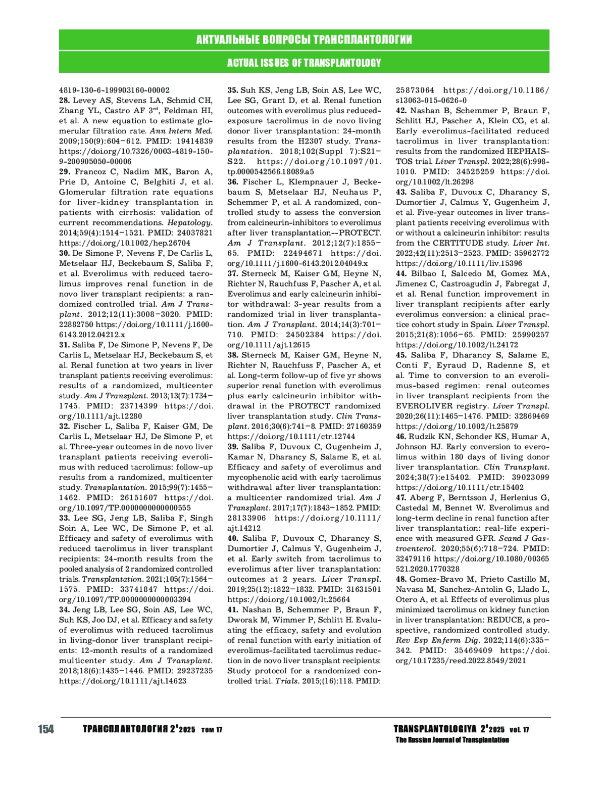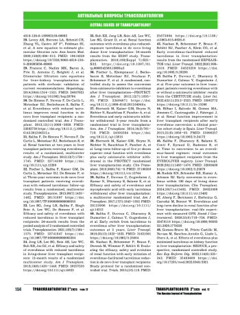 16. Сюткин В.Е., Салиенко А.А., Журавель С.В., Новрузбеков М.С. Изменение скорости клубочковой фильтрации у реципиентов печени после снижения экспозиции ингибиторов кальциневрина с одновременным назначением эверолимуса на протяжении первого года после конверсии иммуносупрессии. Вестник трансплантологии и искусственных органов. 2021;23(4):32-41. DOI: 10.15825/25/1995-1191-2021-4-32-41