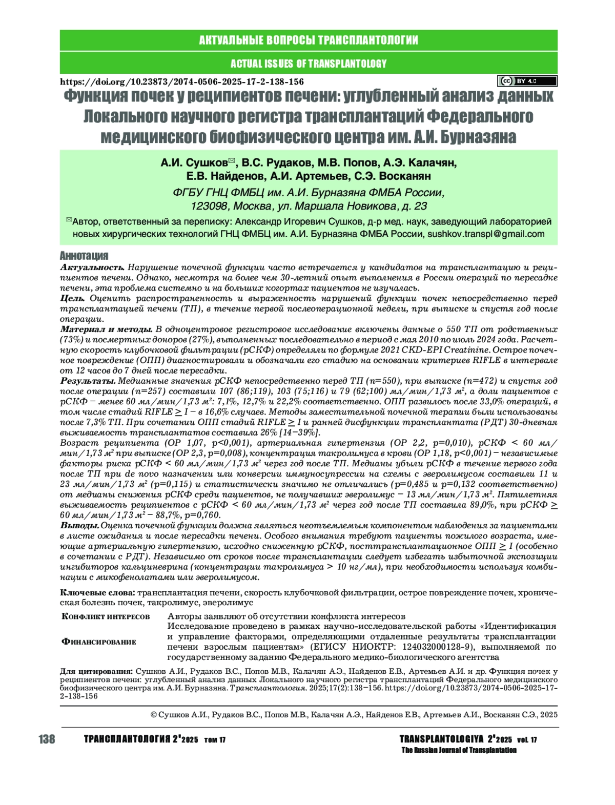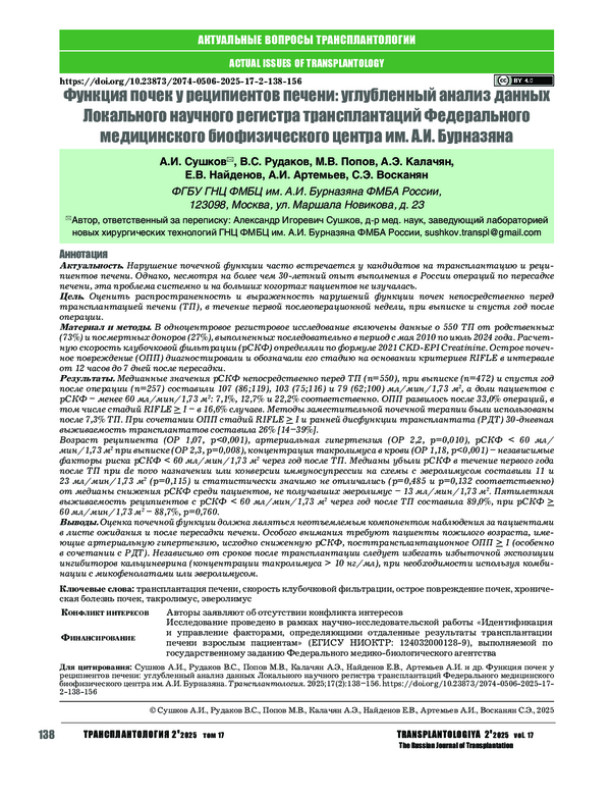 Нарушение почечной функции часто встречается у кандидатов на трансплантацию и реципиентов печени. Однако, несмотря на более чем 30-летний опыт выполнения в России операций по пересадке печени, эта проблема системно и на больших когортах пациентов не изучалась.