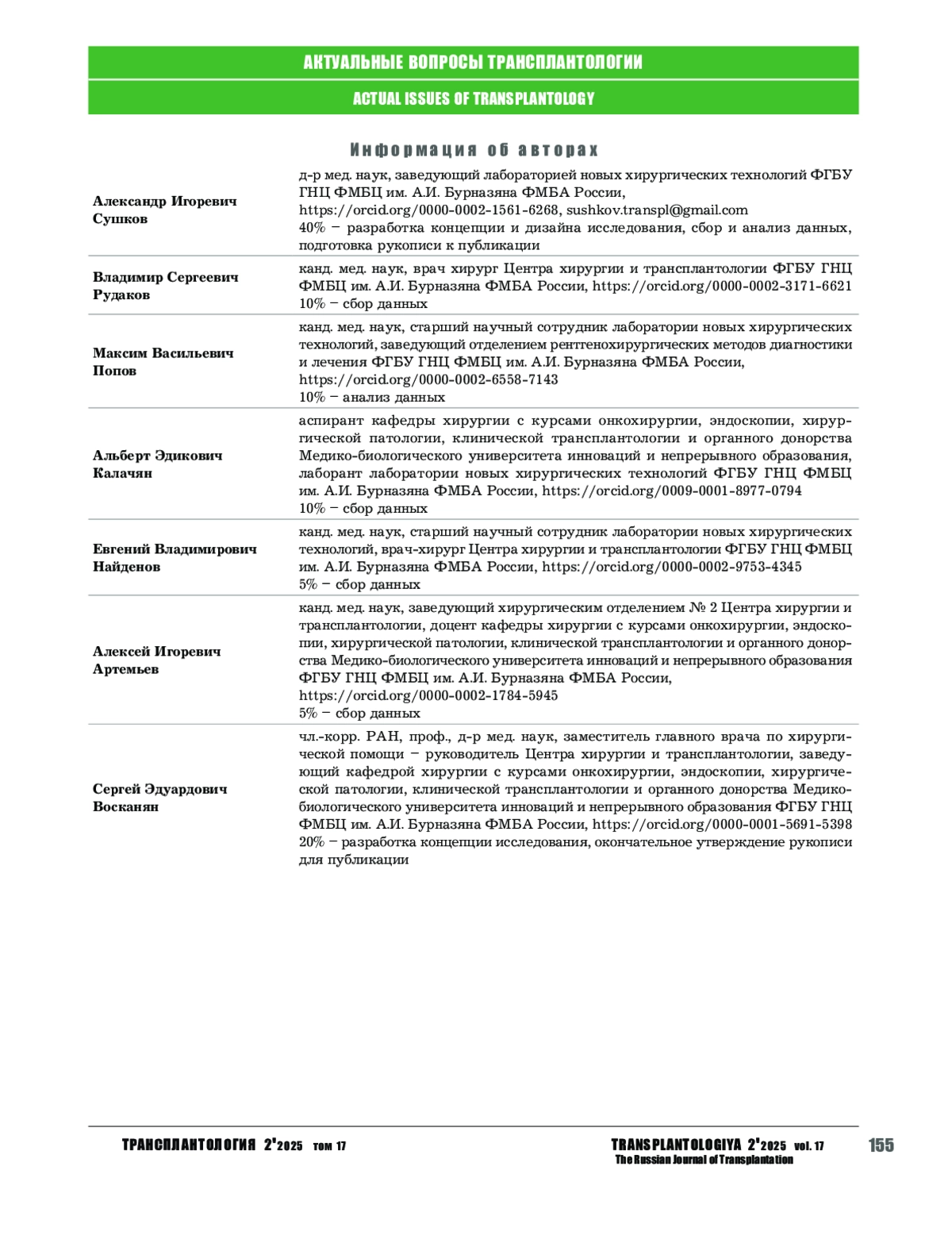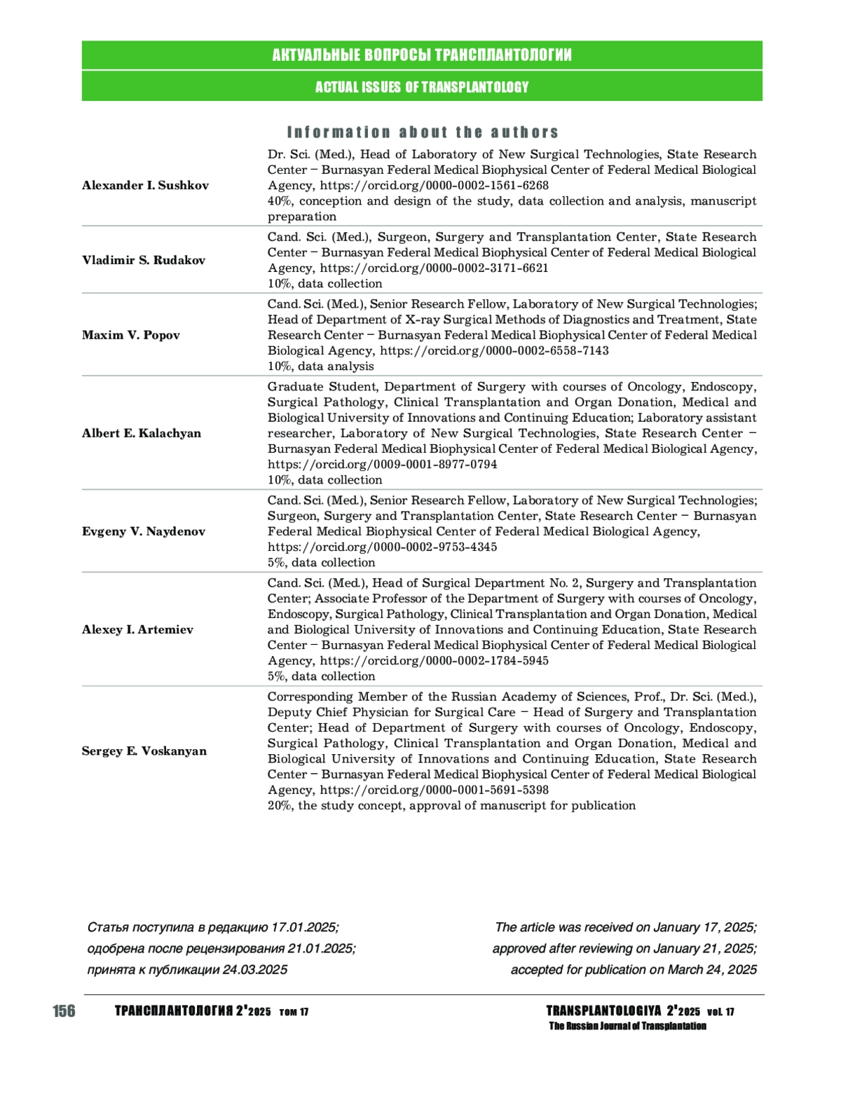 4. Восканян С.Э., Сушков А.И., Артемьев А.И., Рудаков В.С., Колышев И.Ю., Губарев К.К. и др. Программа трансплантации печени в Федеральном медицинском биофизическом центре им. А.И. Бурназяна: опыт 500 операций. Хирургия. Журнал им. Н.И. Пирогова. 2024;(7):45-60. DOI: 10.17116/hirurgia20240714