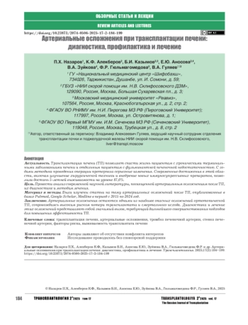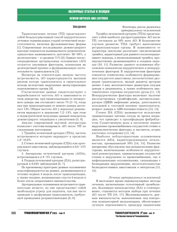 Трансплантация печени (ТП) представляет собой безальтернативный способ хирургического лечения терминальных стадий печеночной недостаточности, включая фульминантные формы [1]. Современные исследования демонстрируют высокие показатели выживаемости реципиентов: однолетняя выживаемость достигает 80–99%, а десятилетняя – в среднем 71% [2]. Однако послеоперационные артериальные осложнения (АО) остаются значимым фактором, влияющим на долгосрочный прогноз и функциональную состоятельность трансплантата [3].