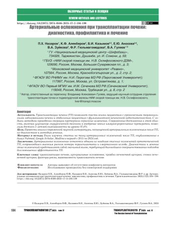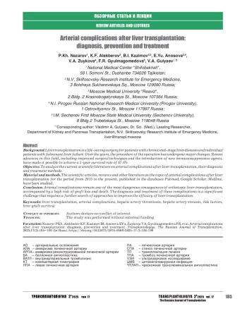 Заключение. Артериальные осложнения остаются одними из наиболее опасных осложнений ортотопической ТП, сопровождаясь высоким риском потери трансплантата и смертельного исхода. Диагностика и лечение этих осложнений представляют собой значимый вызов, требующий дальнейшего совершенствования подходов для повышения эффективности ТП.