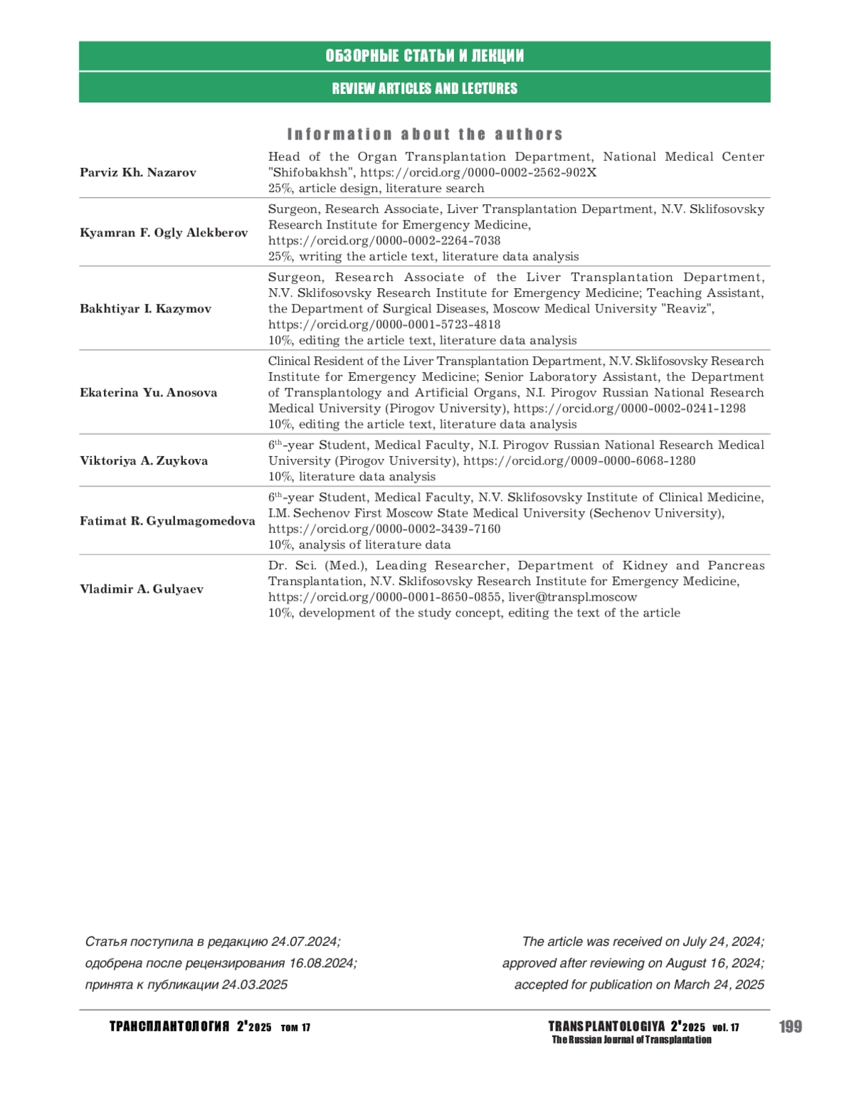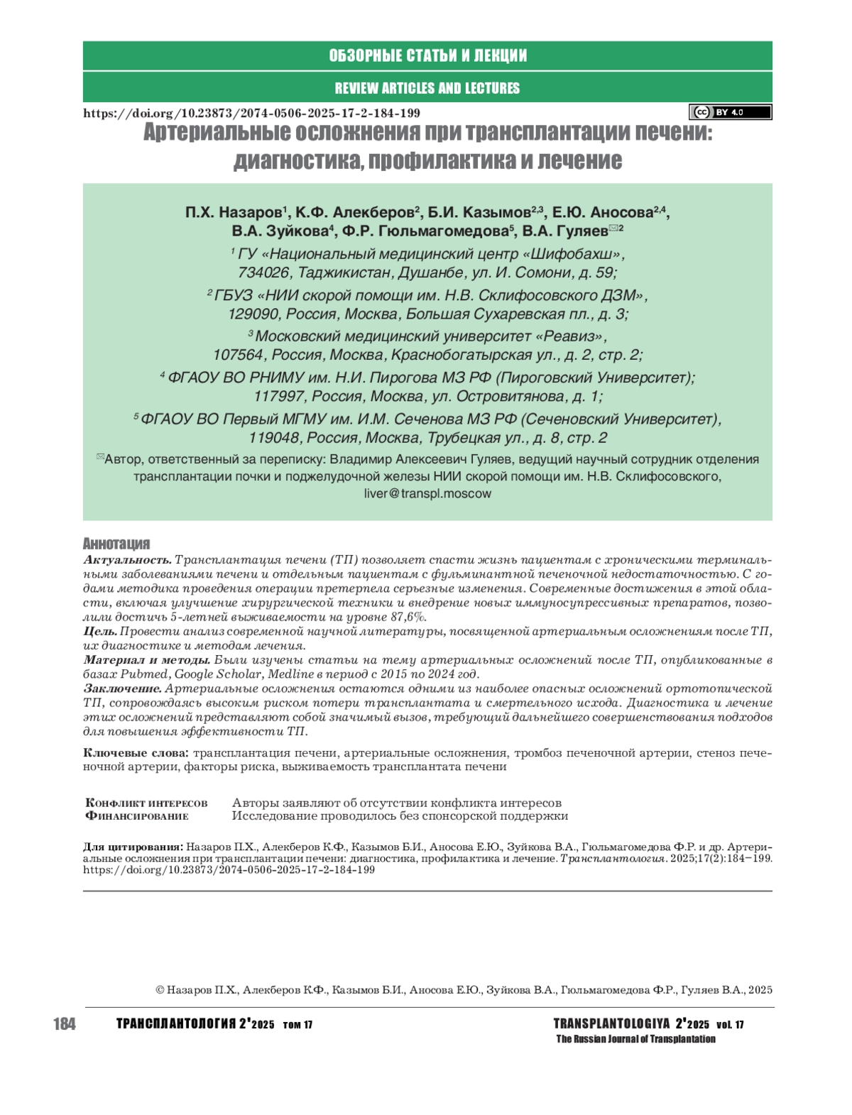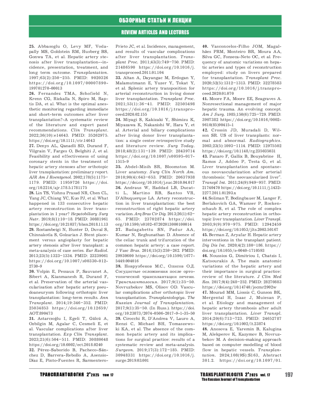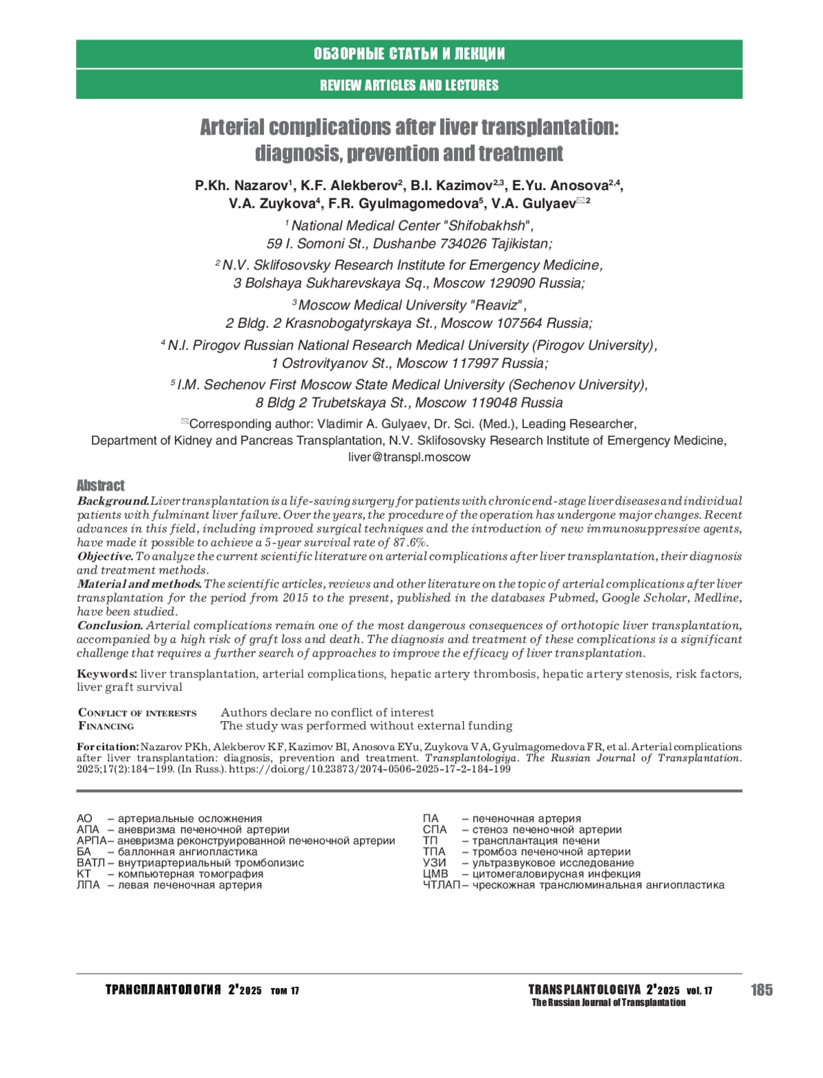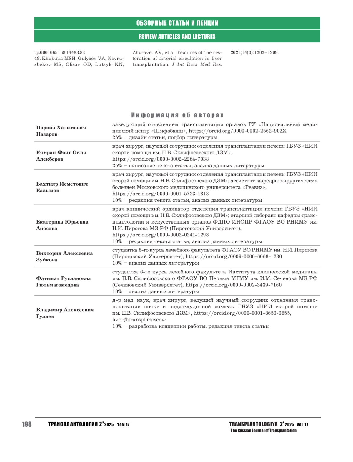 49. Khubutia MSH, Gulyaev VA, Novruzbekov MS, Olisov OD, Lutsyk KN, Zhuravel AV, et al. Features of the restoration of arterial circulation in liver transplantation. J Int Dent Med Res. 2021;14(3):1202-1209.