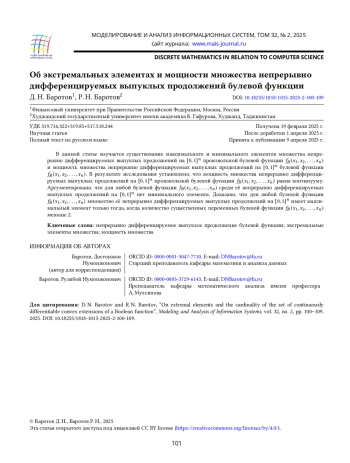 11. D. N. Barotov and R. N. Barotov, “Construction of smooth convex extensions of Boolean functions,” Russian Universities Reports. Mathematics, vol. 29, no. 145, pp. 20-28, 2024, https://doi.org/10.20310/2686-9667-2024-29-145-20-28.
